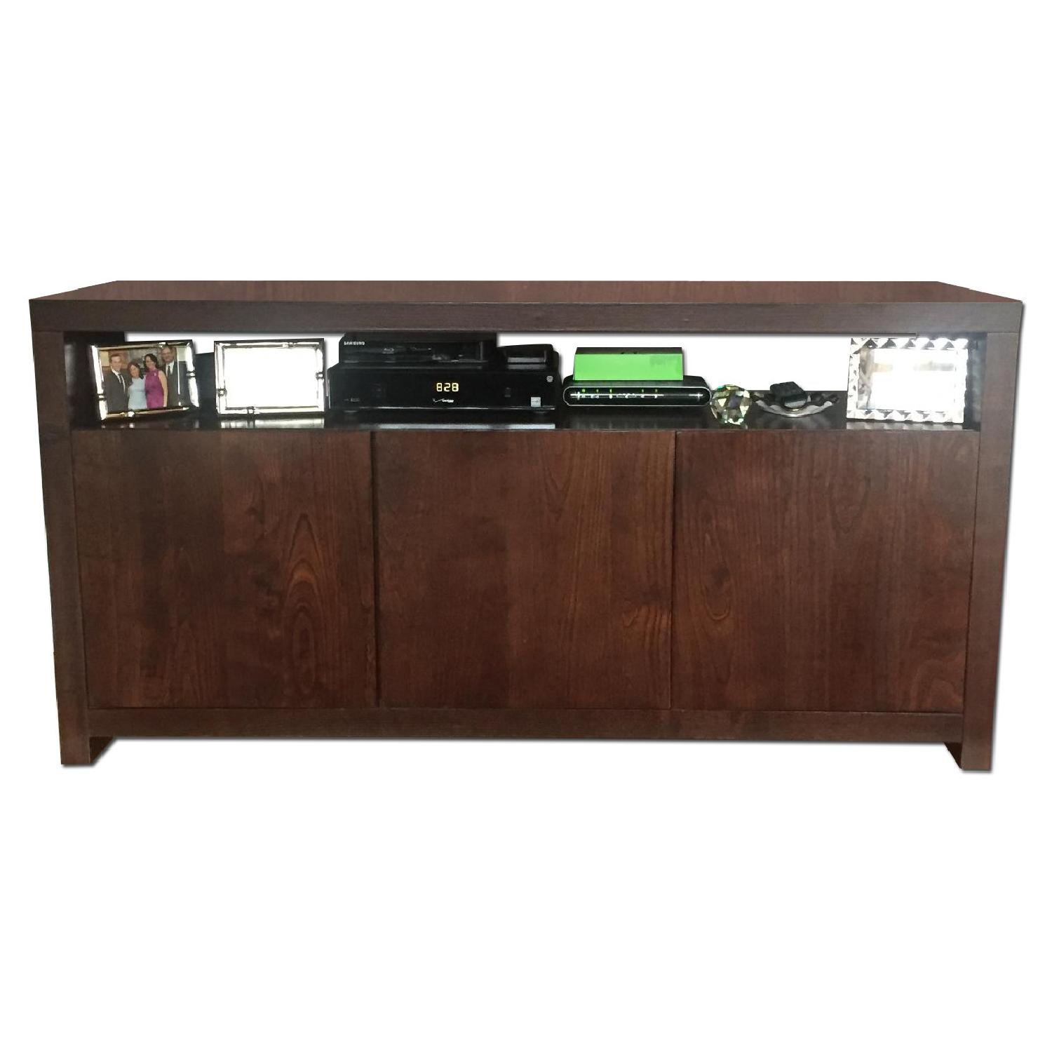 Seller's Notes:CB2 Dark Wood Media Console with three cabinets for great storage space. Each cabinet has 1 adjustable shelf.