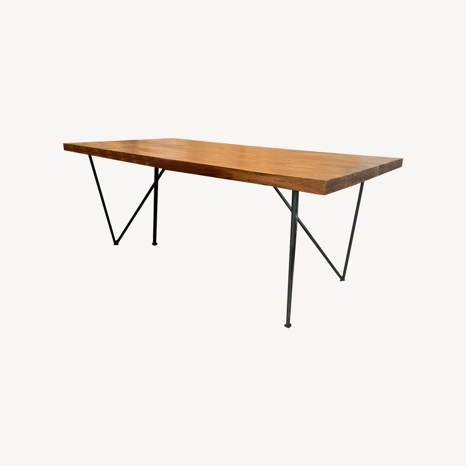 Seller's Notes:This upsized beauty is all about the rich grain of gorgeous acacia wood. Smooth wood planks sit on an architectural iron "W" base that's hand welded and powdercoated to match. Seats eight comfortably, ten if you must. Learn about Jonas Wahlström on our blog. CB2 exclusive. Dylan 36"x80" Medium Acacia Dining Table. 80"Wx36"Dx29.5"H Exclusive design by Jonas Wahlström Acacia wood planks; each is unique Water-based clear lacquer sealant Iron legs powdercoated graphite with a sandblasted finish Seats up to 10 Coasters recommended Protective floor pads recommended Wipe clean. No abrasive cleaners or furniture polish Made in India