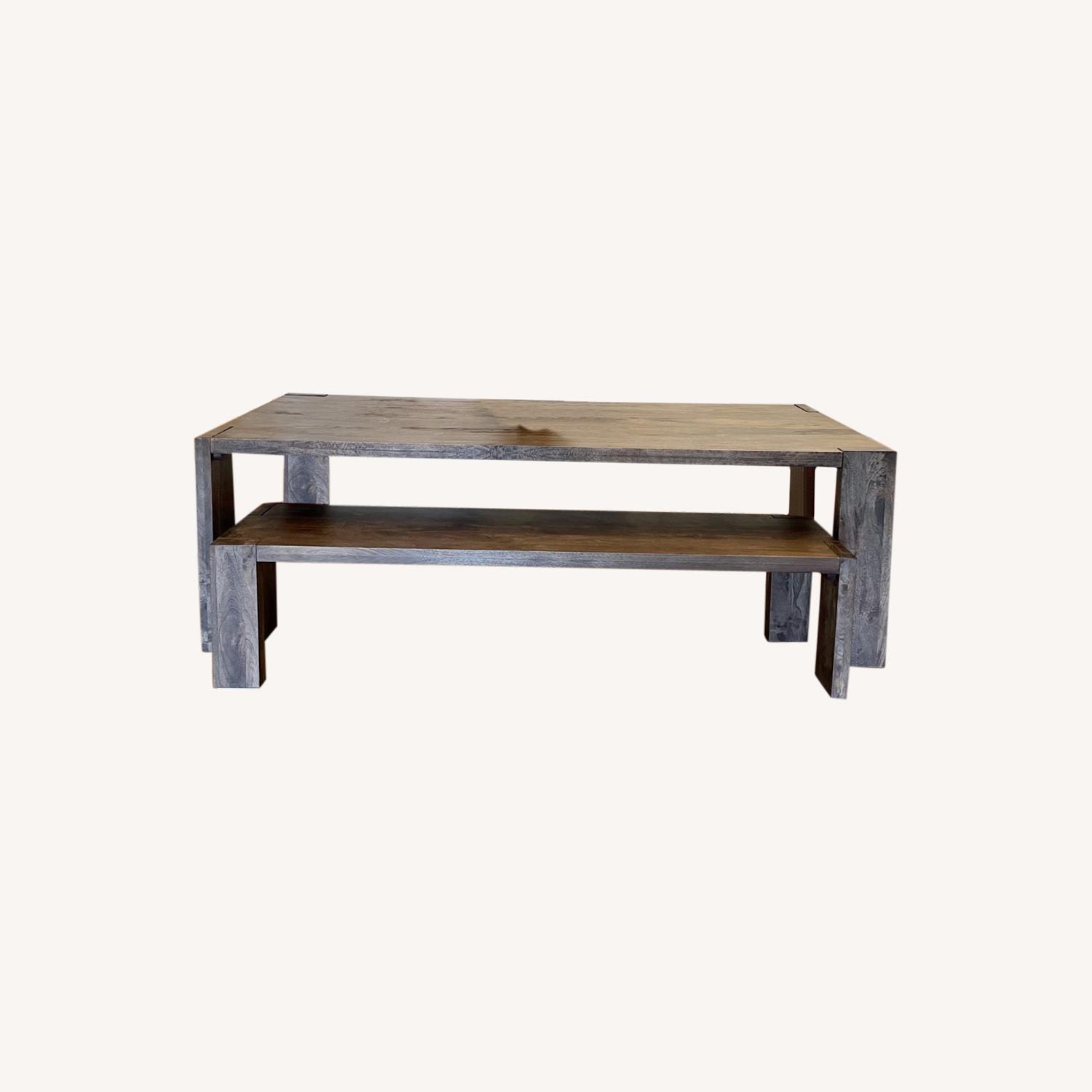 Seller's Notes:I am selling this gorgeous dining table + bench set. This is a sturdy and well built table set that could sit up to 10 people (8 very comfortably). This set is sleek, expensive looking and durable (we have two small kids, and there is barely one scratch). We love, love, love this set! We’ve had it for the past 3 years, and are only selling it because we are moving out of the country in a couple of months and will not bring any furniture. Both the table and the bench are still for sale at CB2 for $1,568 ($1,099 for the table and $469 for the bench). The price listed is for the SET (table and bench). Dimensions: Table: Width: 91" Depth: 35" Height: 29.5" Bench: Width: 78" Depth: 16.5" Height: 18" Website description: Plantation grown solid mango wood planks shift perspective in asymmetric wide/narrow leg rotation. Bird's eye view from the top is stunning: sweeping woodgrain in midtone brown, inset legs create directional geometry (and dinner conversation). XL span seats party of ten. Sustainable, plantation grown solid mango wood top and legs Midtone brown finish Tops will vary Wood grain on legs will vary Wood characteristics: mineral deposits, grain, knots and seasonal splitting may occur with changes in humidity and are inherent in product Seats up to 10 The legs of the table can be disassembled if needed (to go thru doors if needed, etc)