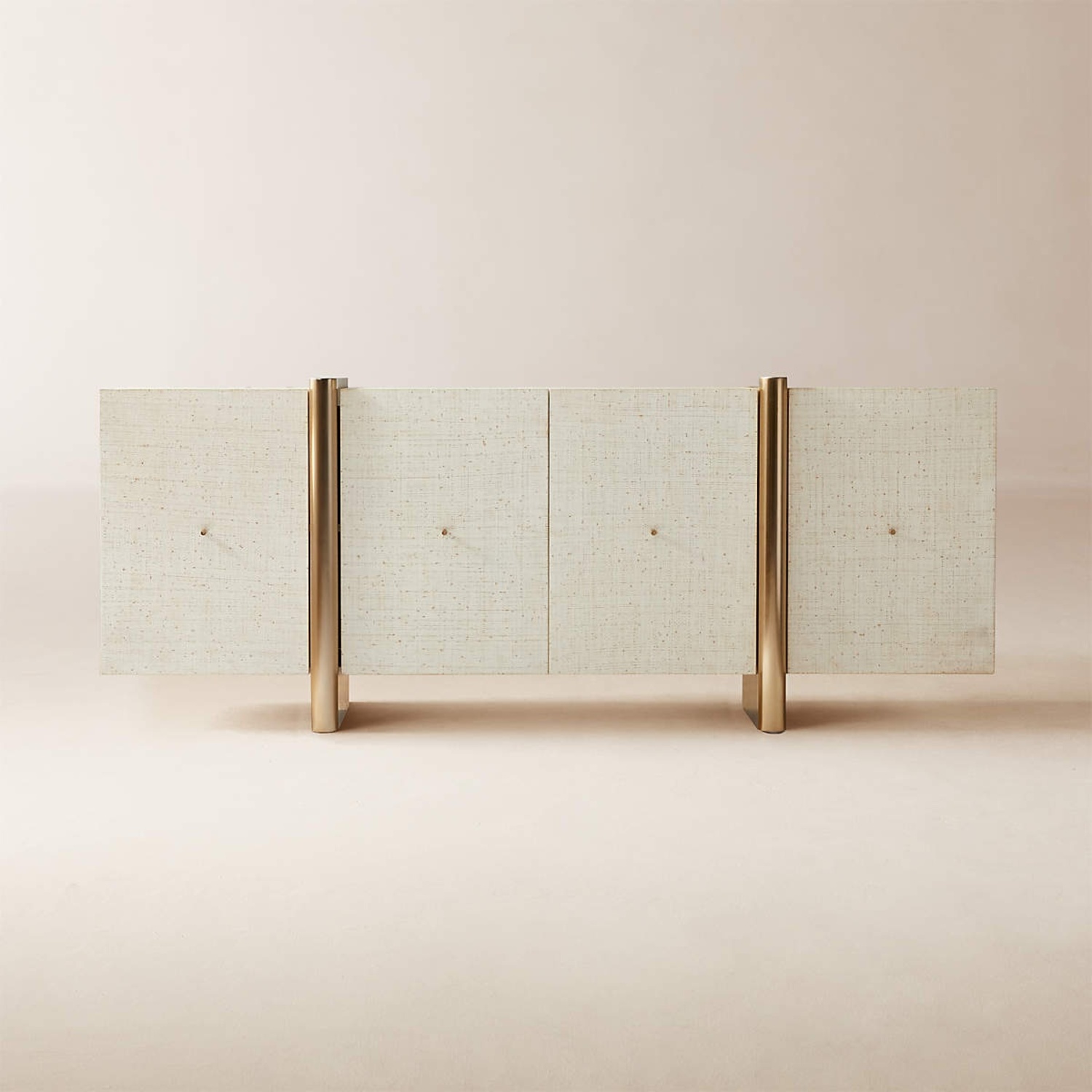 Designed by Melbourne-based VUUE, this statement piece is an understatement. Rounded, chunky brass-finished legs intersect four doors clad in lacquered linen and sleek brass pulls. The credenza opens to two large shelves with a middle divide and cord cutouts. Designed for an entry, dining or living room moment. CB2 exclusive.