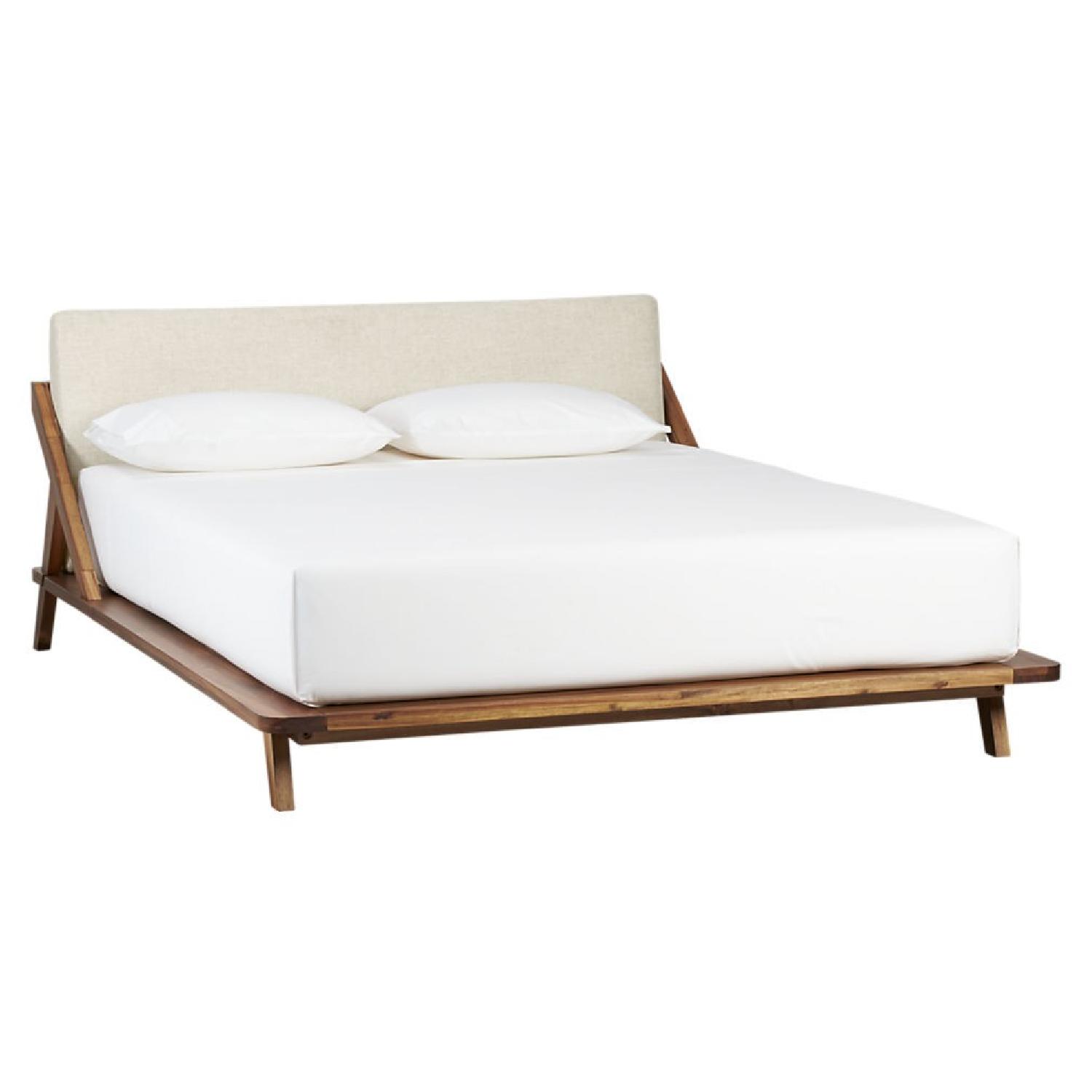 Seller's Notes:Solid sustainable acacia wood bed frame from CB2. The headboard is upholstered in ivory poly/linen with foam padding. It looks beautiful in my bedroom but its often complimented. I need to upgrade to a queen size, hence the sale. I love it so much, I'm purchasing the same one in Queen! The headboard is very comfortable for light reading before bed. Does not make any noise and is in very good condition. I've had it for a year and it has not been exposed to any smoke or any pets.
