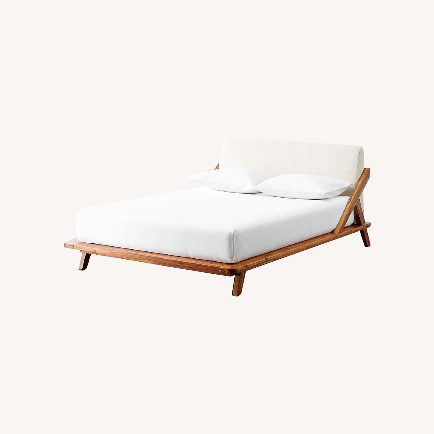 Seller's Notes:Designed by Jannis Ellenberger Frame: Solid sustainable acacia wood Headboard: Upholstered in ivory poly/linen with foam padding Finished back can float in room Genuine CB2. This bed is less than 2 years old and is exceptional condition. It is in our guest bedroom and has barely been used. We are switching this room to a nursery, which is the only reason we are selling this bed. It is beautiful and matches most decor.
