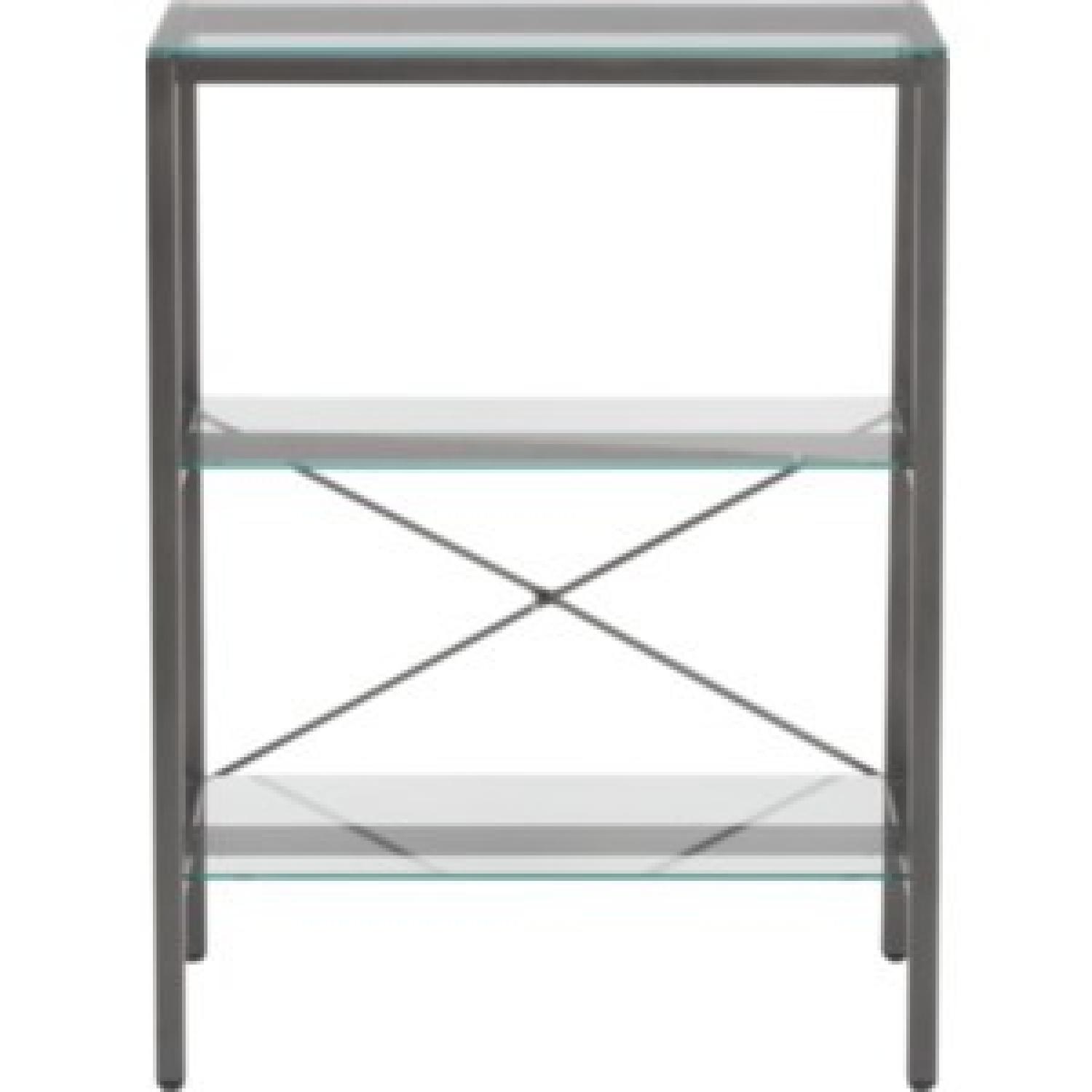 Seller's Notes:Steel and clear tempered glass shelves Works great in living room as shelving unit and as media console, or in office/study Three clear glass shelves Steel tube frame with powder-coat finish, levelers included Perfect condition!