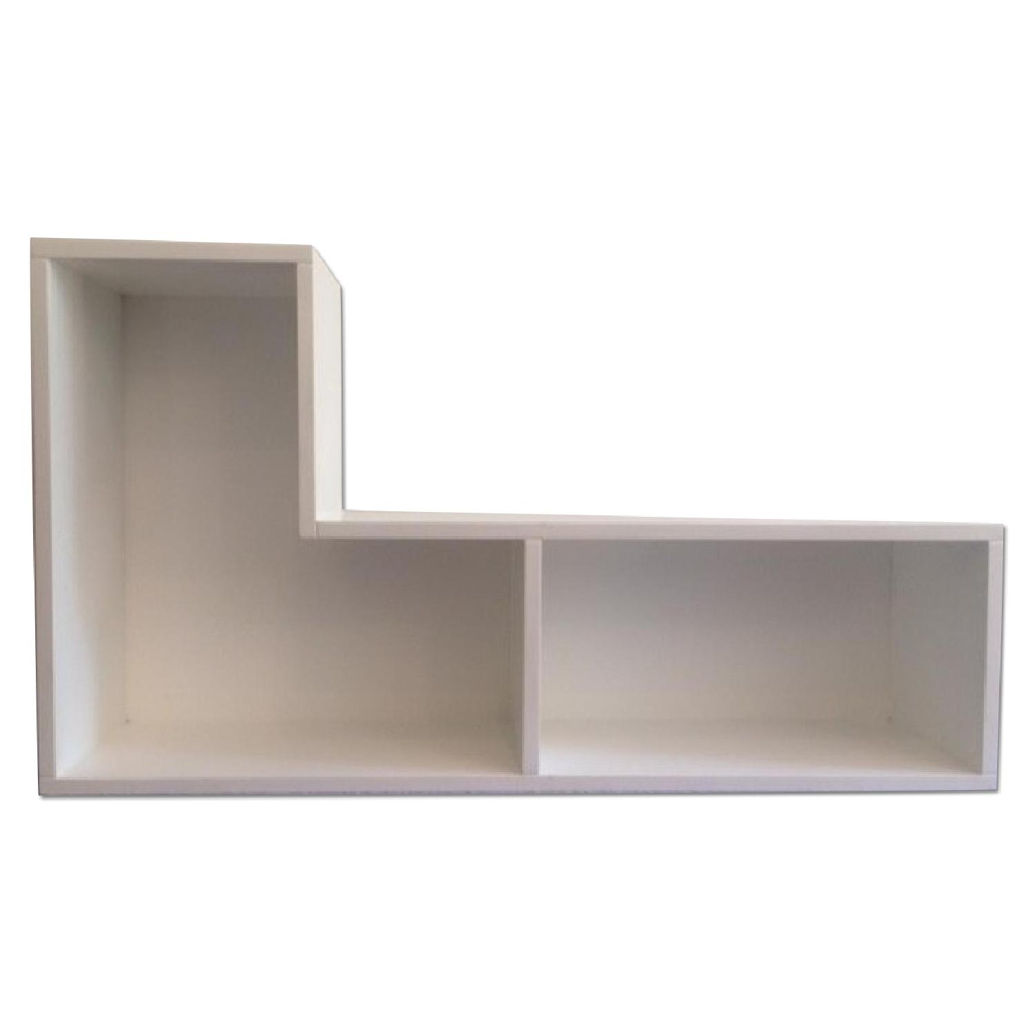 Seller's Notes:Matte white L-format designed by Mark Daniel of Slate Design bends the storage rules with its modular possibilities. Engineered wood box with fixed partition takes a 90-degree turn to display books, objects, photos, even wine. Included is a set of two. Best offer considered.