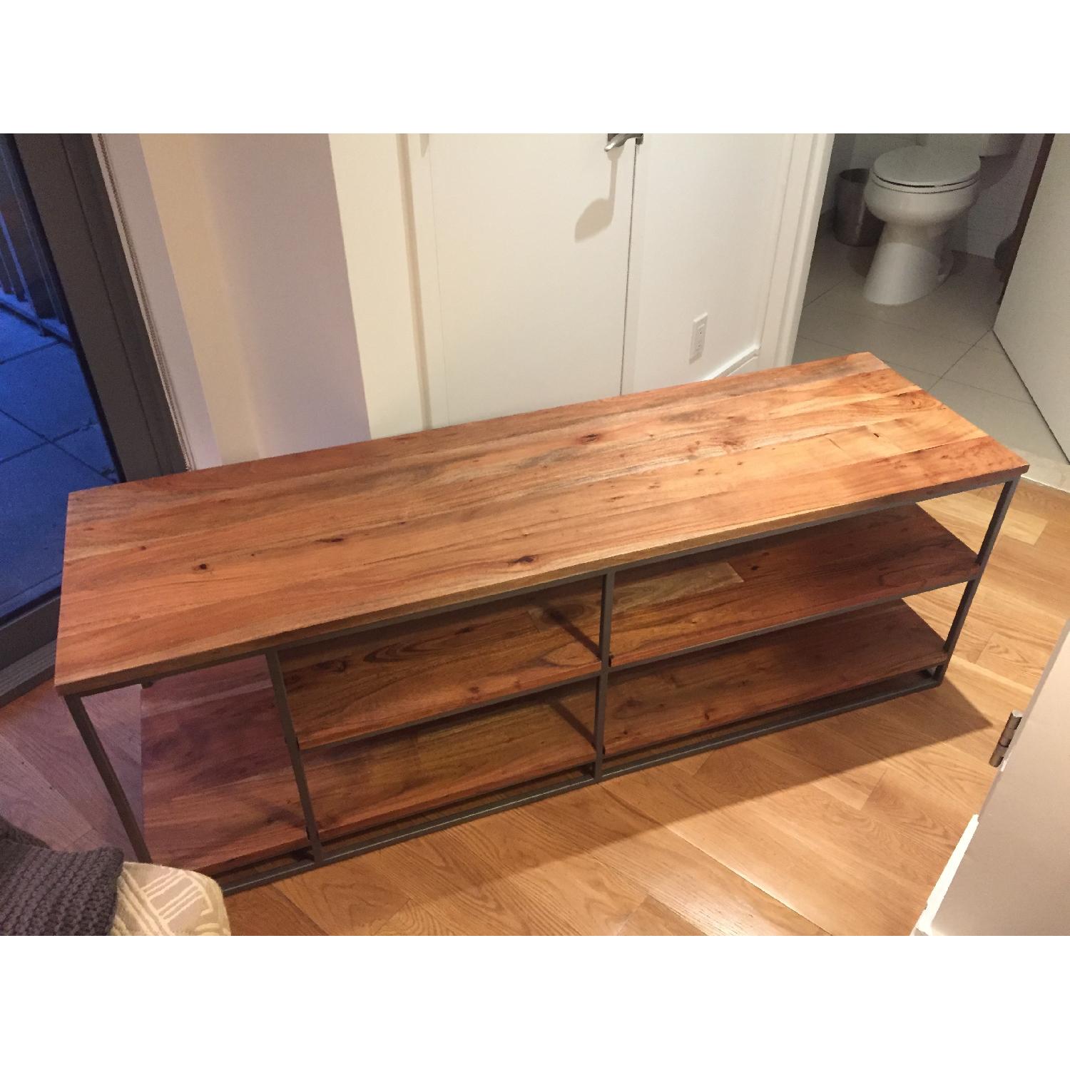 Seller's Notes:Architectural three-tier structure entertains in the raw. Braced by sleek iron frame, wide planks of solid sustainable acacia wood show beautiful light-to-dark tones, active grain and naturally occurring knots. Open shelving displays flat screen up top, audio and video gadgets below. Asymmetric design features taller storage at one end to host LPs and gaming towers. Also doubles as room divider, bookcase or elevated coffee table. Solid sustainable acacia wood Iron frame Wood characteristics: mineral deposits, grain, knots and seasonal splitting may occur with changes in humidity and are inherent in product Works as media console, coffee table, room divider or bookcase Included anti-tip hardware recommended for added stability Made in India Overall Dimensions Width: 61" Depth: 17.75" Height: 21.75" Tall Shelf Space Opening Width: 9.25" Depth: 17.5" Height: 16.5" Small Shelf Opening Width: 19.75" Depth: 17.75" Height: 7.5" Wood Thickness Height: 1.5" Metal Thickness Height: 0.5" Floor To Bottom Shelf Height: 4"