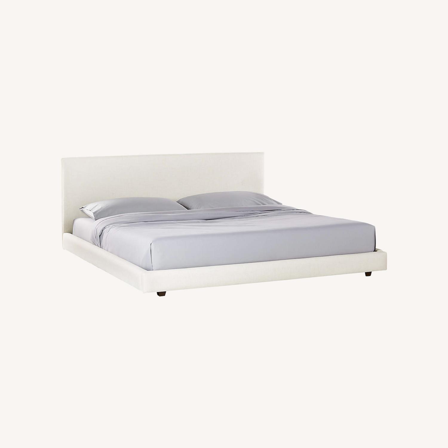 Clean box silhouette sleeps hi-fashion in soft white linen-y weave. Dreamy in hi/lo proportions: Slim cushioned headboard scales up for comfy reading in bed on low-profile frame. Tailored neat all the way around so it can float in the room. CB2 exclusive.