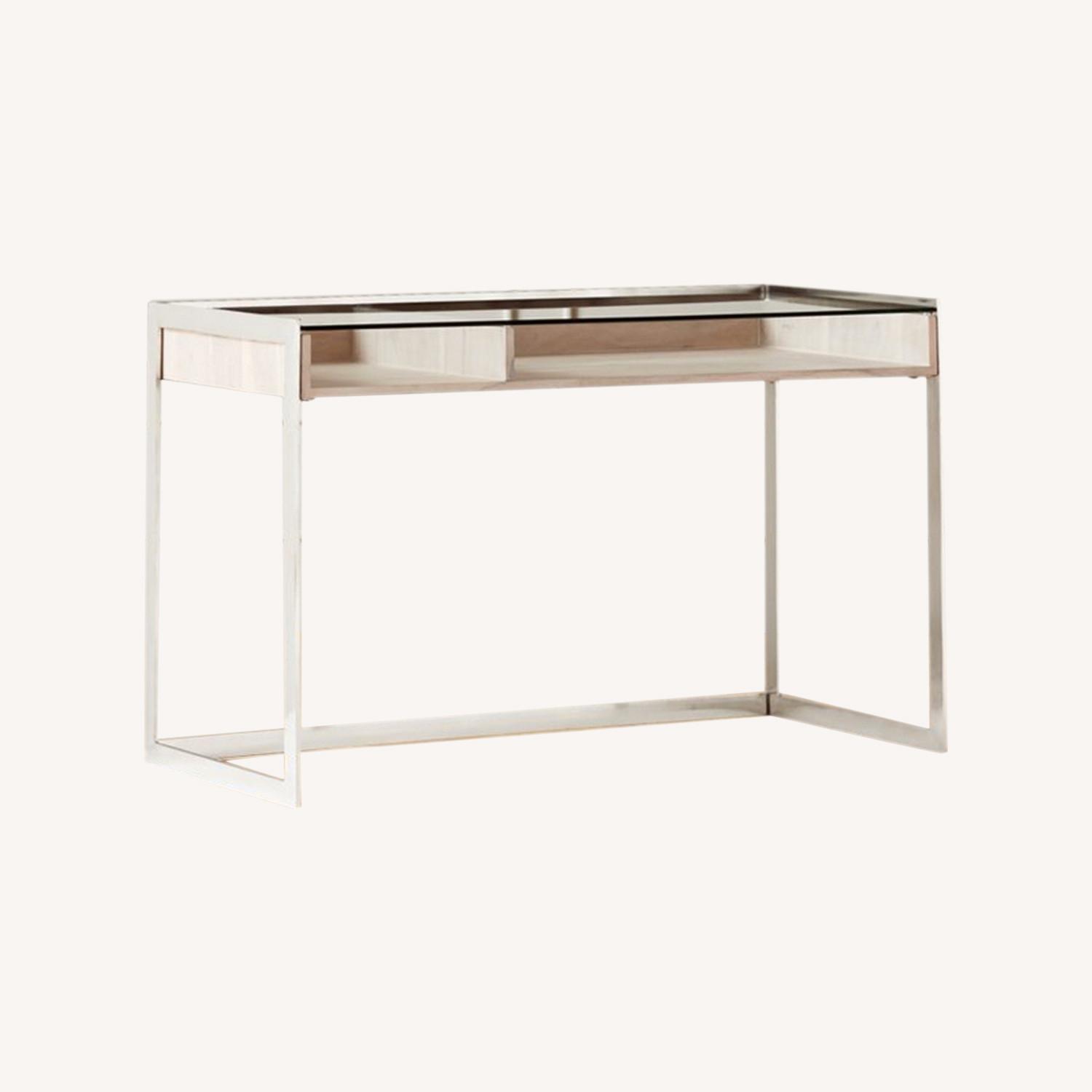 Seller's Notes:A curator's dream. Toughened glass tops whitewashed acacia wood for a functional desk that doubles as a display case. Neatly holds files and supplies or collectibles to inspire productivity. Finished modern with sleek, polished stainless steel legs. CB2 exclusive. Whitewashed acacia wood Polished stainless steel legs Toughened glass top Clean with a soft cloth; no abrasive cleaners Made in India