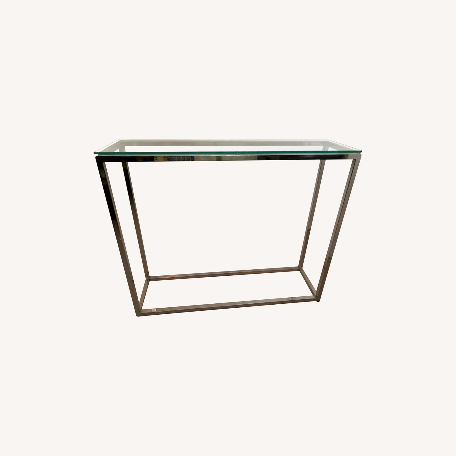 Seller's Notes:Narrow table from CB2 that is great for nooks. Glass top is in great condition - no chips on the edges. There are minor blemishes to the metal finish on one of the legs.
