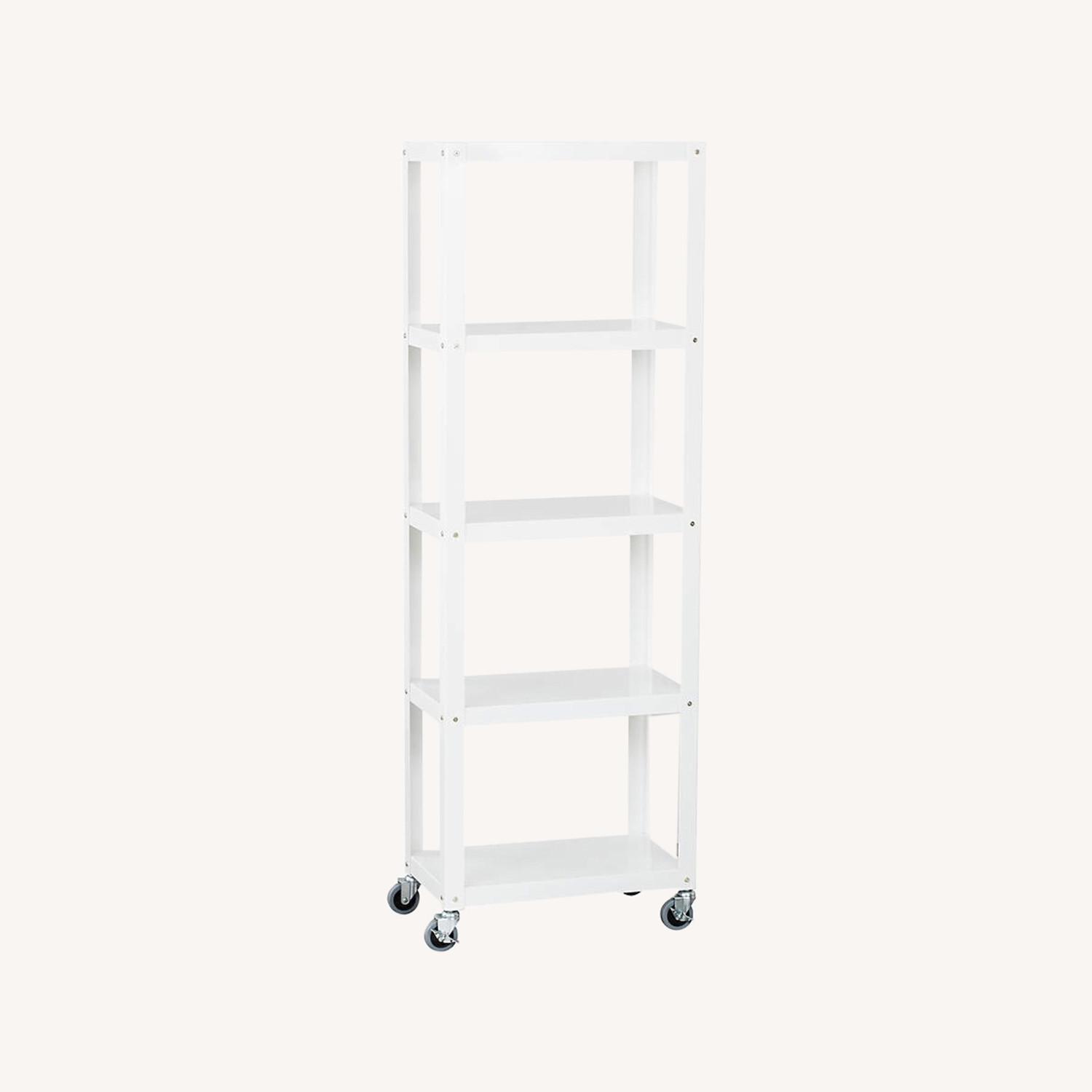 Seller's Notes:Two Available! Happy to send actual photos. Fully working. Fully assembled. Five shelf cart. Sturdy. Stable. Industrial revolutions. Nifty metal bookcase in black powdercoated finish rolls into place on four wheels; two wheels lock. Five fixed shelves stash printer, supplies, files. We've also been known to stash towels on it in the bath, microwave and cookbooks in the kitchen. CB2 exclusive. Go-Cart White Five-Shelf Rolling Bookcase. 24"Wx14"Dx72.25"H Steel with a White finish Utilitarian design Four casters; two lock Clean with a soft, dry cloth Made in Taiwan Original price $229 Negotiable.