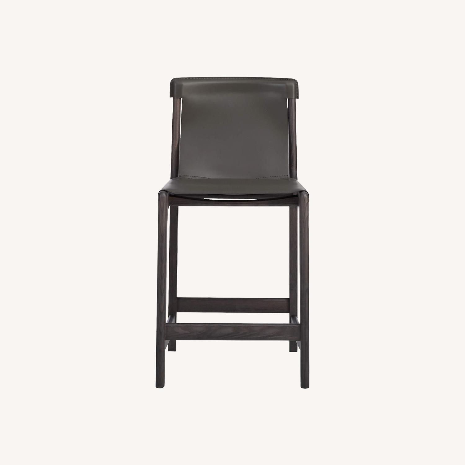 Seller's Notes:Made in Italy by a family-owned furniture company and designed by Balutto Associati, grey-finished ashwood counter stool invites guests to sit back and sip a while. 100% mid-grain grey Italian leather stretches taut across the seat then slings loosely up and over the top to bring a laid-back attitude to the bar. Learn more about Balutto Associati on our blog. CB2 exclusive. Burano Charcoal Grey Leather Sling Counter Stool Set of 2 21.75"Wx21"Dx36"H Designed by Balutto Associati Seat: 100% mid-grain grey Italian leather; each will be unique Frame: ashwood with grey finish Dust with a soft, dry cloth; no abrasive cleaners Do not leave spills unattended Keep out of direct sunlight to prevent fading Made in Italy