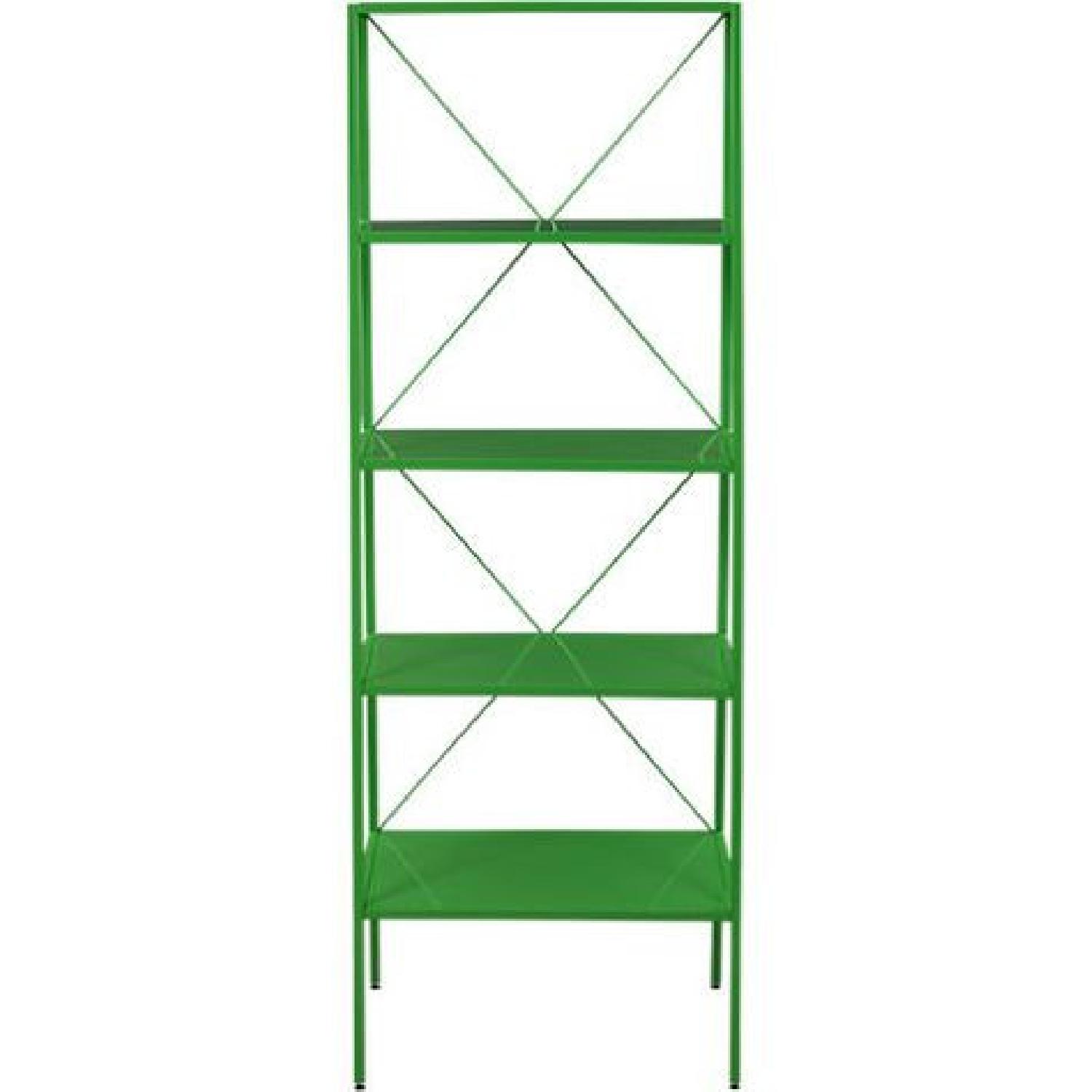 Seller's Notes:Unique trapezoidal bookcase. Powder-coated Clover Green stainless steel metal. Self leveling feet. These shelves, while made for general use would also work well in an office, garage, craft room, durable for teens' rooms, or handy for a laundry room. A few scratches from use and moving but very good overall condition. Retails new for $199. Overall Dimensions: 41.25 Lbs Width: 26" Depth: 22.75" Height: 72.5" Bottom Shelf: Width: 26" Depth: 21" 2nd From Bottom Shelf: Width: 26" Depth: 18.25" 3rd From Bottom Shelf: Width: 25.875" Depth: 15.75" 4th From Bottom: Width: 25.875" Depth: 13" Top Shelf: Width: 25.875" Depth: 10.5" Space Between Shelves Approx Height: 15"
