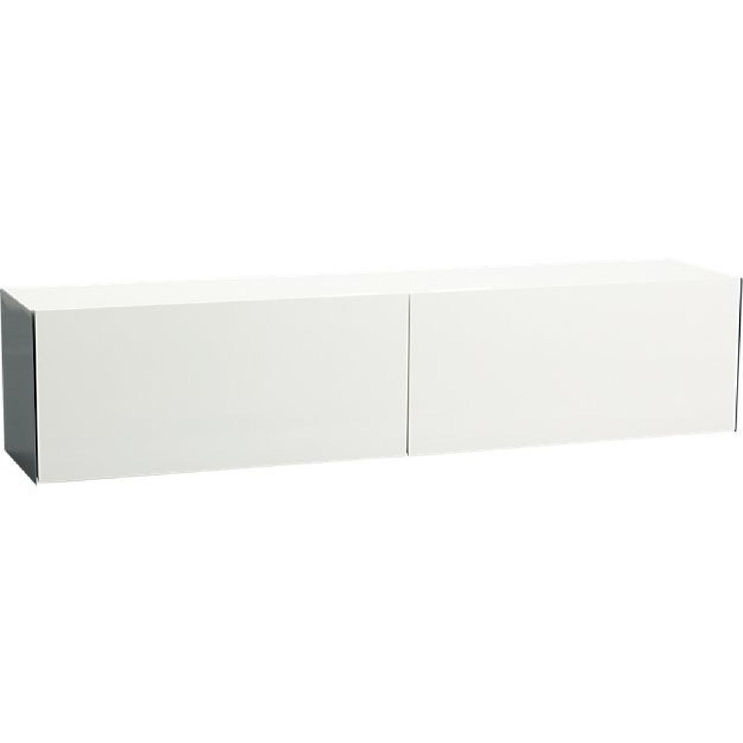 Seller's Notes:The piece is in excellent condition, only has minor scratching on one of the sides. Wall-mount hardware is included. Two-tone Slick hi-gloss bright white double doors flip to surprise grey powder coated steel walls in a design by Diana Lu of Slate Design. White lacquered engineered wood with super-thin grey sides that hint at the interior. Great storage solution to free up floor space in dining, entry, hallway, bath, bedroom.