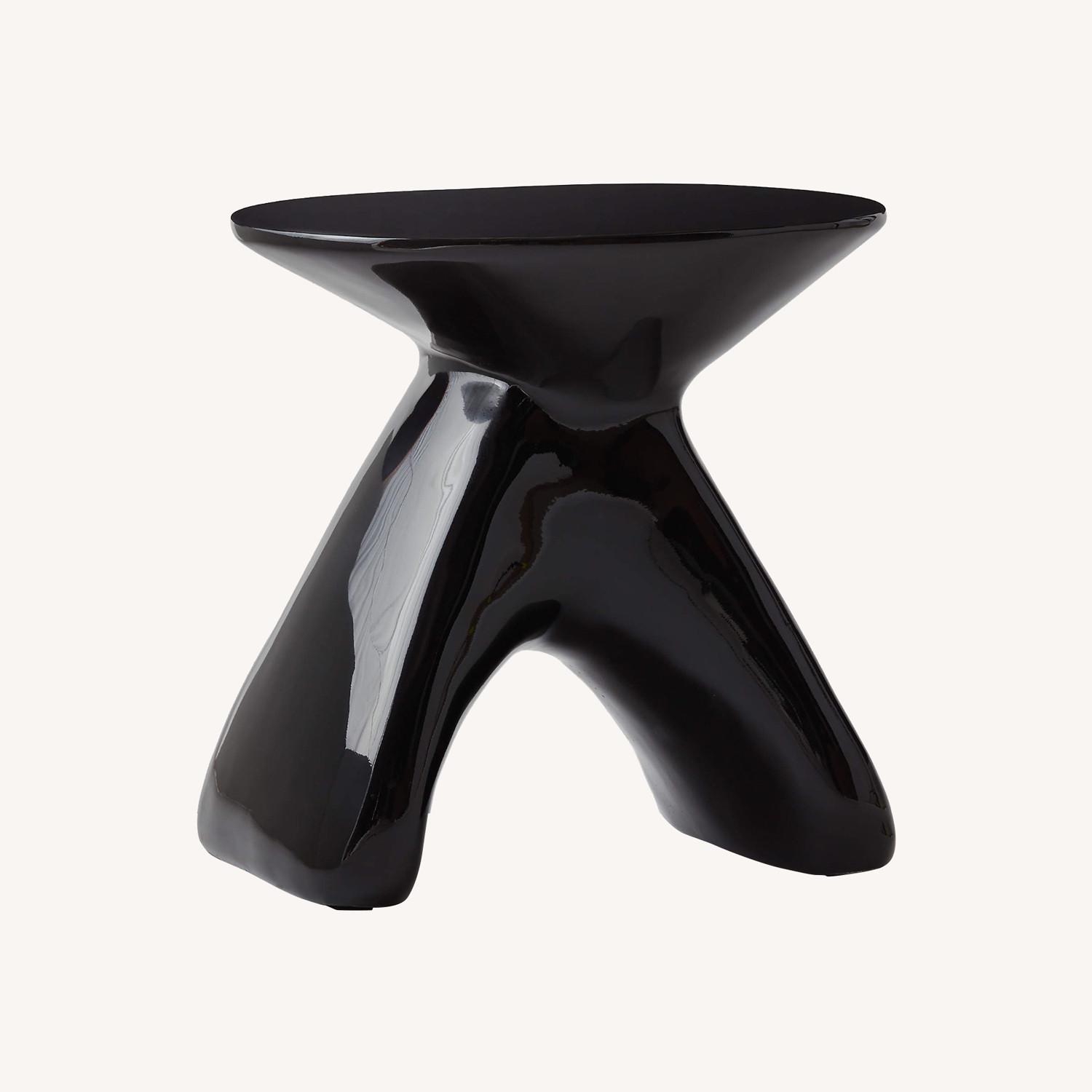 Seller's Notes:This side table set from CB2 and designed by Caleb Zipperer brings a sculptural sensibility to any room. Amorphic base meets the flat surface at a well-proportioned taper, all finished in a high-gloss black. With a solid core construction, designer has given the table substantial heft—a nice balance to its organic winsomeness. Can be used outdoors with proper care. High-Gloss Black Cement Side Table 17.75"Wx14"Dx18.25"H Cement, sand, stone and fiberglass High-gloss black finish Outdoor-safe Wipe with a soft, dry cloth Use coasters to protect surface from moisture and scratching