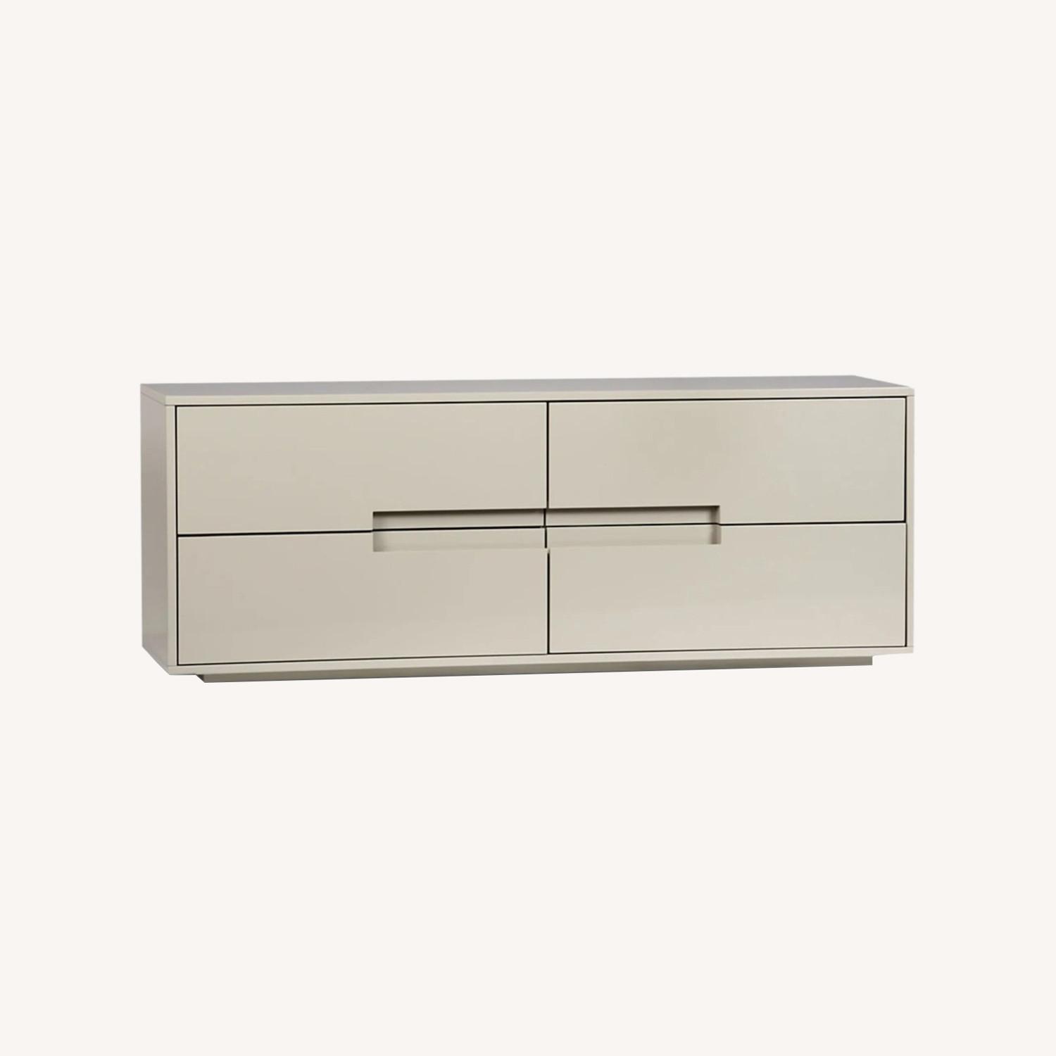 Seller's Notes:four corners. Low, lean and long meets slick hi-gloss white at a four point modern intersection by MASHstudios. Symmetry centers four drawers that pull open sans hardware revealing the inside's all white, too. Engineered wood on solid plinth base with immaculately finished back that can float in the room. A real statement piece. latitude white low dresser is a CB2 exclusive.