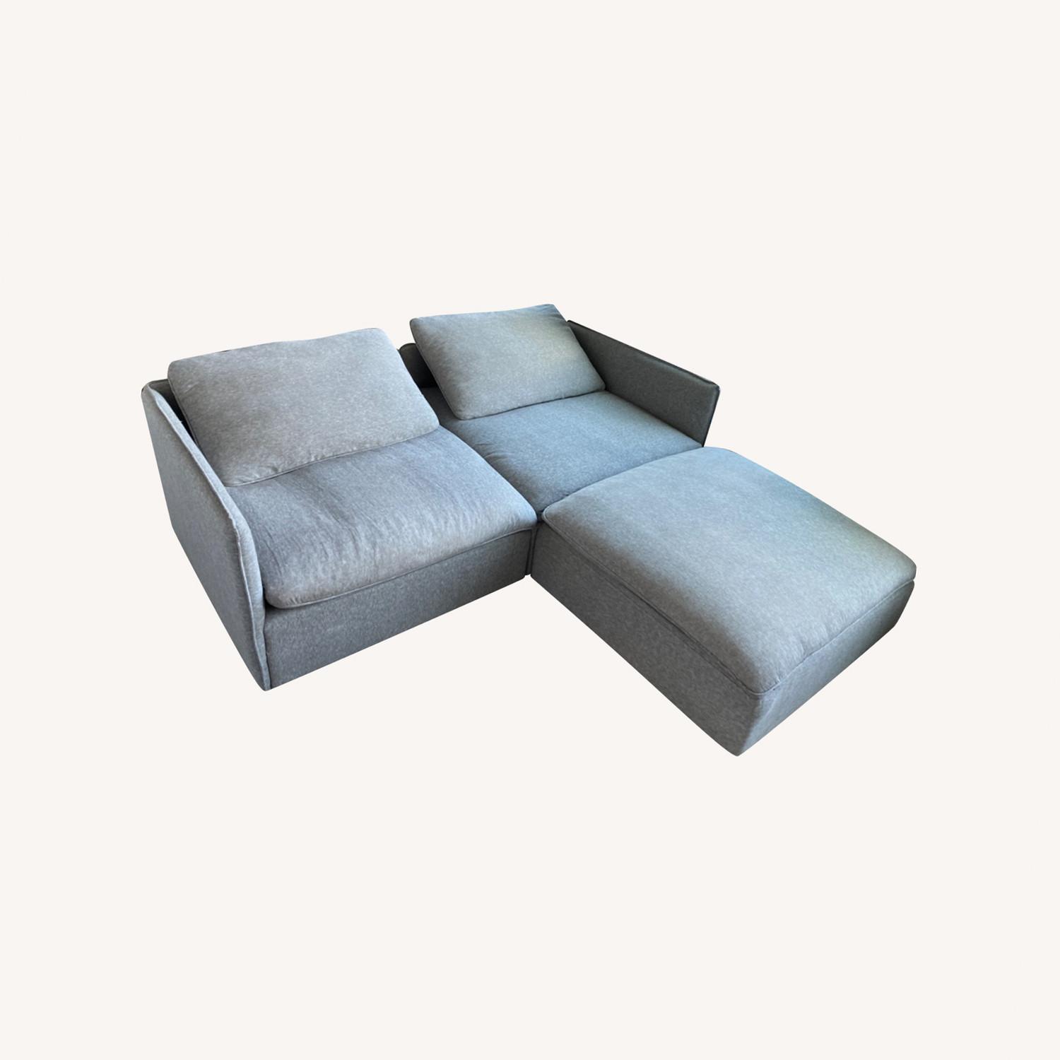 Seller's Notes:Purchased three years ago for $4,546. Most comfortable couch I have owned, but unfortunately does not fit in my new apartment. Used condition (one minor coffee stain that is hidden under the back cushion but otherwise in excellent structural shape). Each piece is 43"x43"27" (Ottoman is 21" high). Design by Mermelada Estudio. Feather and down fill with a foam core. Made in USA. Link to items on CB2 site: https://www.cb2.com/lumis-grey-performance-fabric-corner-chair/s563309; https://www.cb2.com/lumis-grey-performance-fabric-ottoman/s563292.