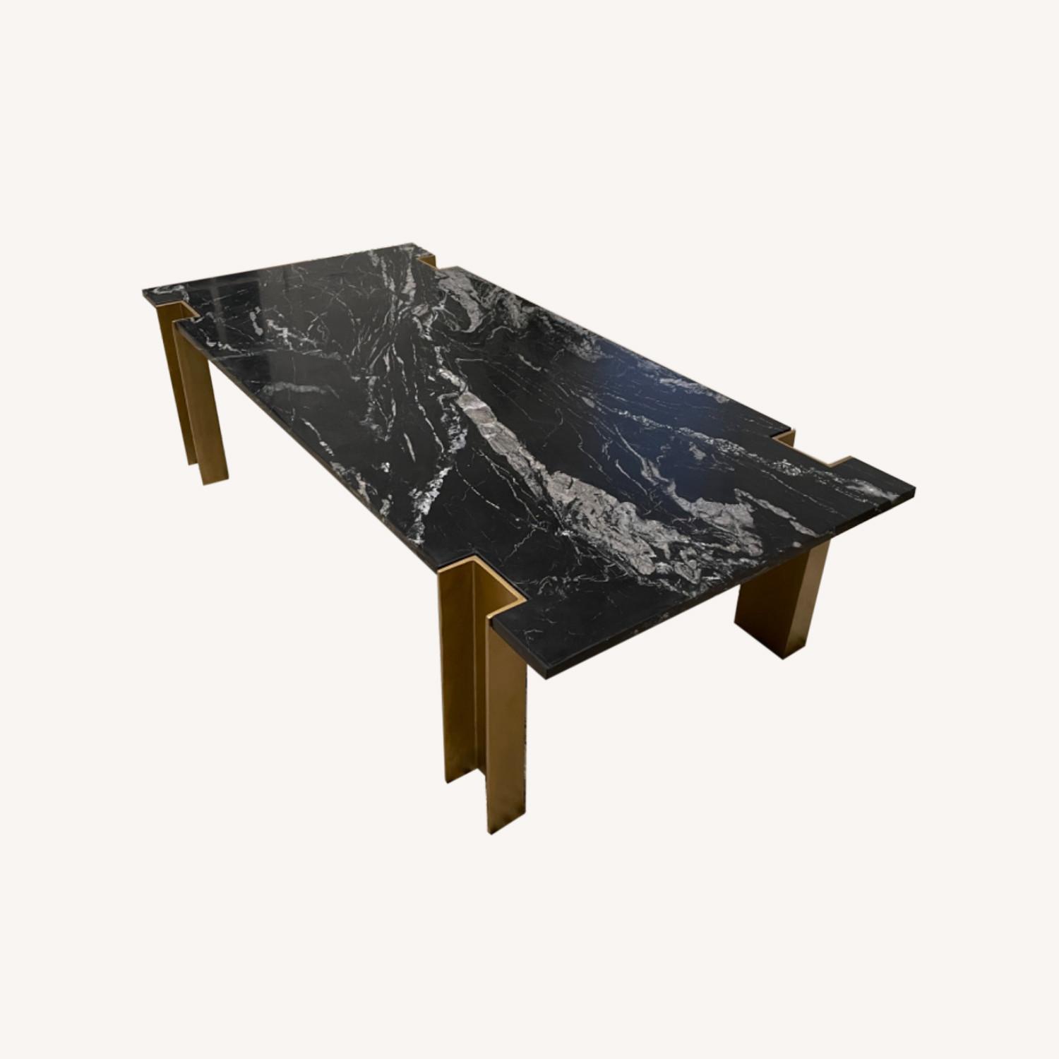 Seller's Notes:Bought in Sept. 2021. Never been touched! Converting room into playroom so sadly, need to sell. DETAILS Polished black marble sits chic atop u-shaped legs finished in deep gold tones. Cut to size, grinded and polished by hand, marble surface features natural white veining that adds nuanced character. Adds understated glam to any space. • Handmade • Black marble • Cast aluminum legs with gold powdercoat finish • Wipe clean Alcide Rectangular Marble Coffee Table. 54"Wx25"Dx15"H