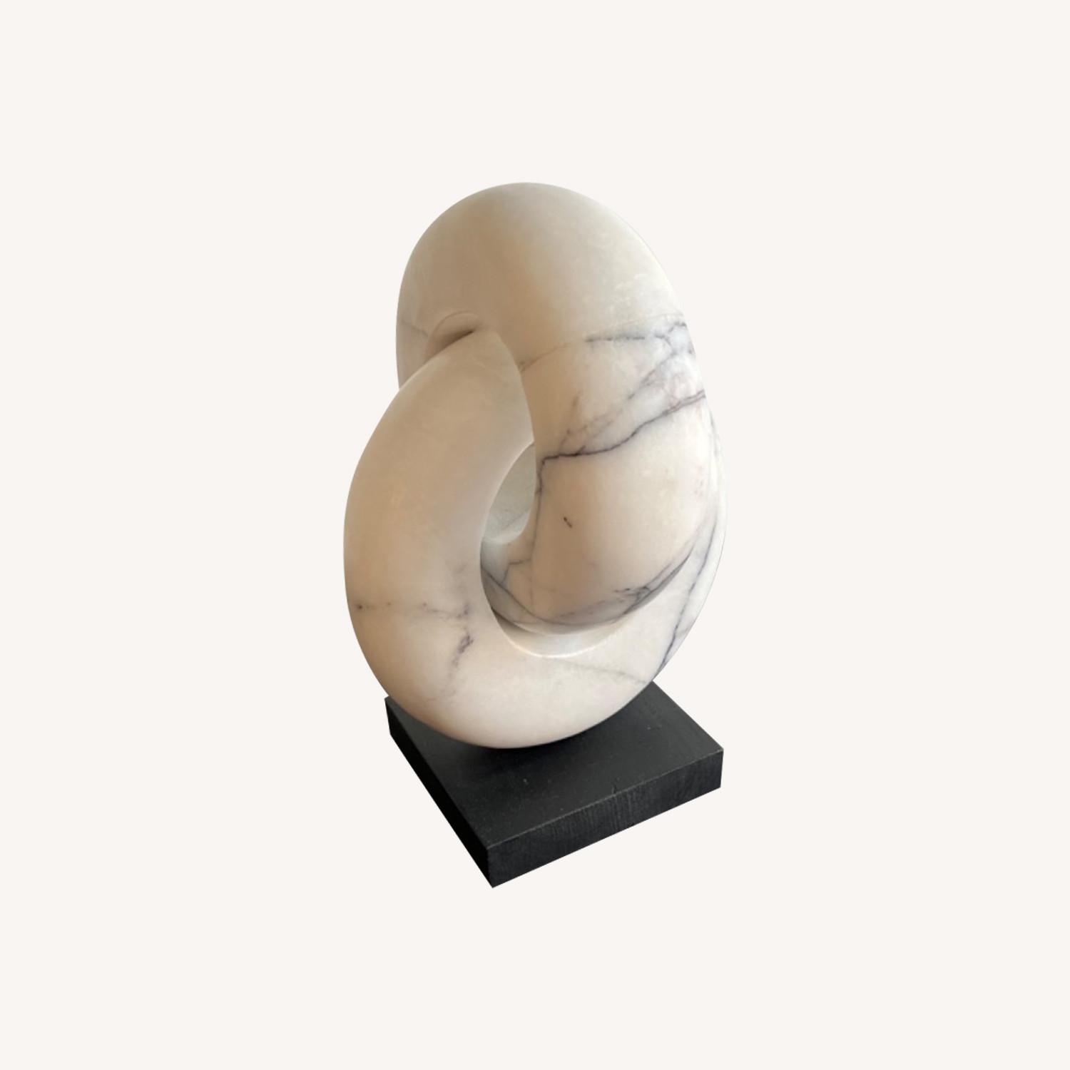 Seller's Notes:Two white floral marble rings interlock without visible seams atop a blackened wood stand. As new. Don't Get It Twisted Marble Decorative Object by Jennifer Fisher 8.25"Wx7.5"Dx10"H By Jennifer Fisher Sculpture: White floral marble Base: Blackened wood Wipe clean with a soft cloth Made in India