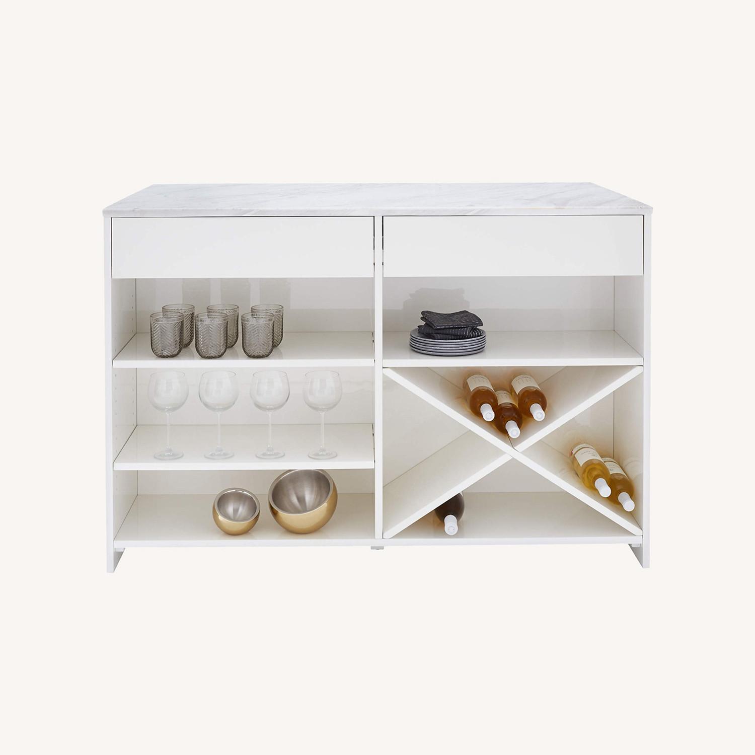 Seller's Notes:Recently bought, beautiful kitchen island. Great storage. Selling as am moving. A center staple for any kitchen. Designed by Mark Daniel of Slate Design, hi-gloss white lacquered wood frame forms nooks and cubbies of all sizes for added kitchen storage. A large slab of honed white marble with grey veining tops the island, overhanging on one side for counter-height stools and chairs to pull up.