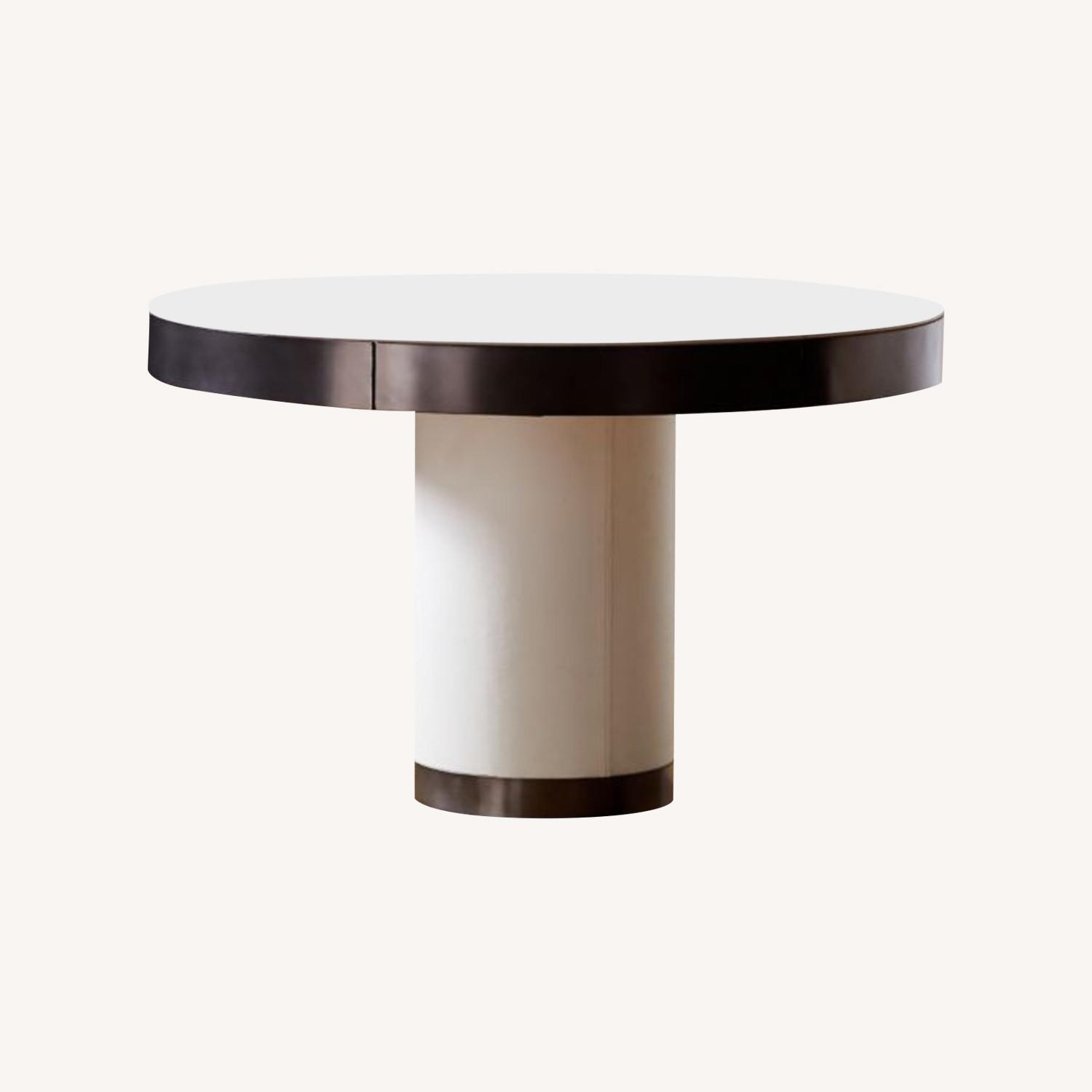 Seller's Notes:Approx. 2 year gently used CB2 Maude gaming table in white leather with black trim accent. Has 2 slide out drawers. A few stains on the table top surface and minor scratches on one side of the black trim.