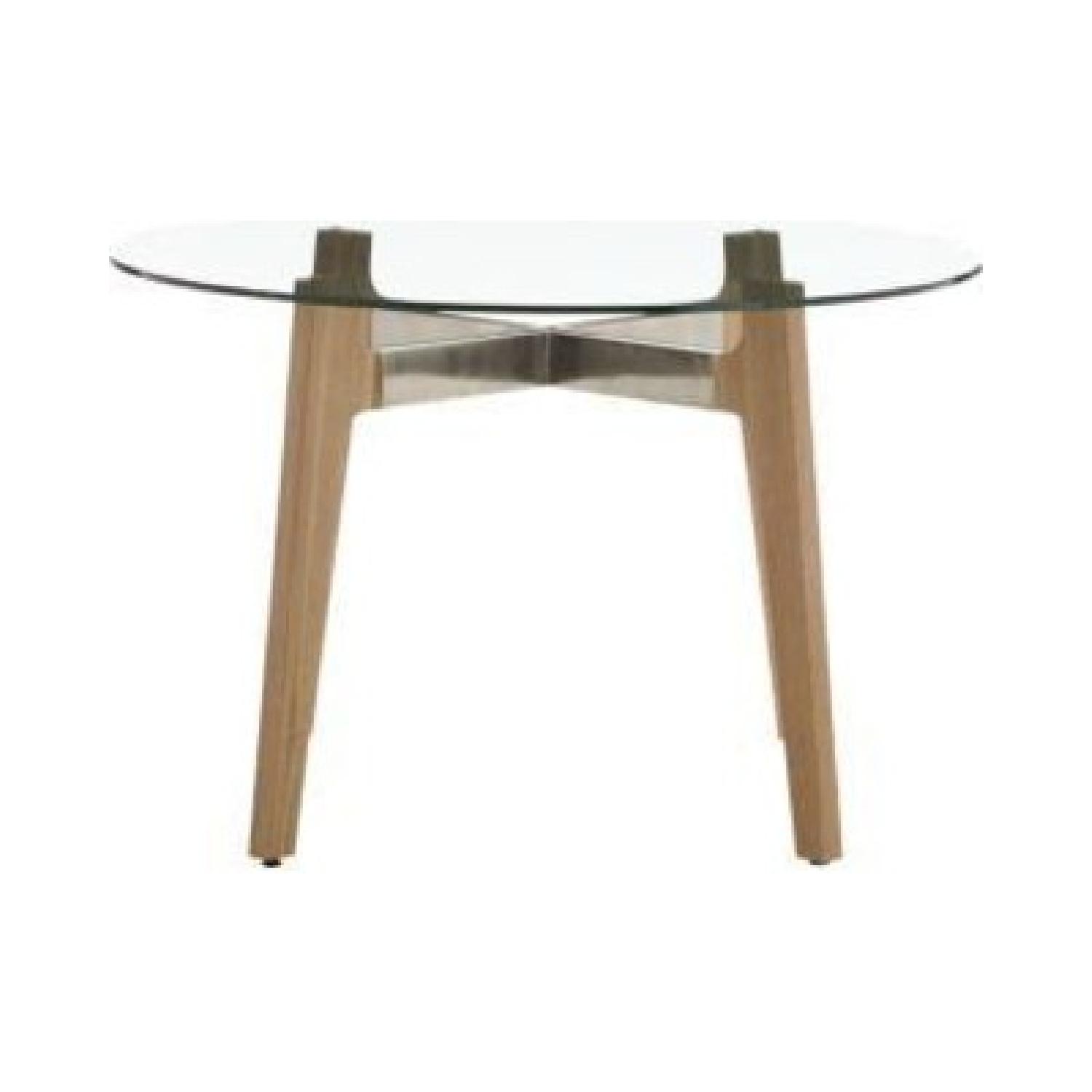 Seller's Notes:Beautiful dining table - classic mid-century modern with wooden legs, glass top. Designed by Ceci Thompson Top is a 47-inch floating round of non-tempered glass Base is composed of solid oak and rubberwood panels with clear lacquer finish, revealing a striated effect of tone and grain Reinforced with iron cross brace with brushed nickel finish Seats up to four