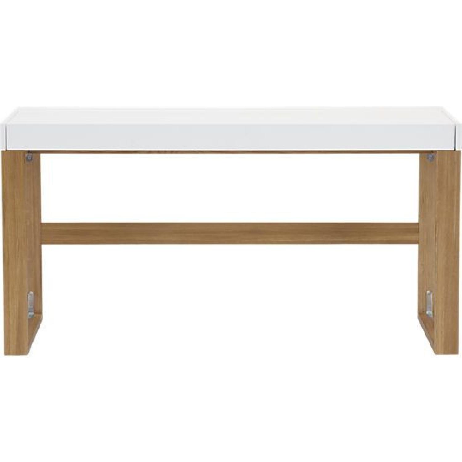 Seller's Notes:Immaculately clean white desktop is either the sign of a highly organized, compulsive neatnik. Or a peek into the genius of designer Manuel Saez. Clever worktop in matte lacquer white engineered wood slides open via integrated pull to reveal nine square feet of stash space for laptop, iPhone, iPad, projects, books, planners, folders, smalls and supplies--even hidden cord cutouts to charge electronics. Solid white oak stretcher base has continuous "U" legs braced with intentionally exposed hardware. Torino Slide Desk Table by Manuel Saez 57″Wx24″Dx29.25″ (17″D sliding top; 7″D fixed back ledge).