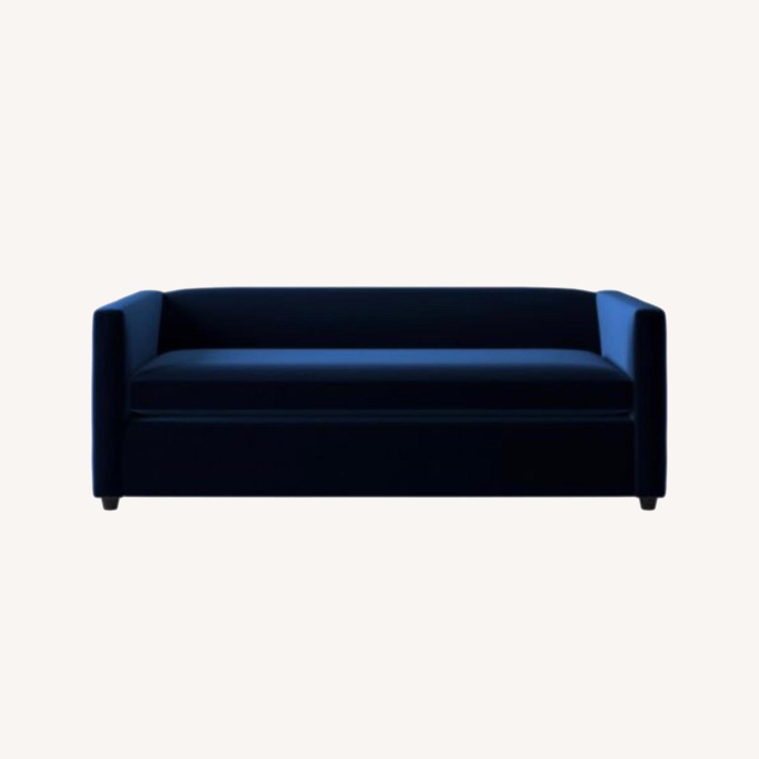 Seller's Notes:Beautiful and cozy sleeper sofa in a high quality indigo velvet-like material. It easily turns into a spacious queen bed inside with 5.25” coil/foam mattress. Excellent condition. Poly fabric: Salt and pepper. Queen-size sleeper. Frame is made with certified sustainable hardwood that's kiln-dried to prevent warping. Genuine CB2 Retail price is $2,230 ($1,899 plus tax).