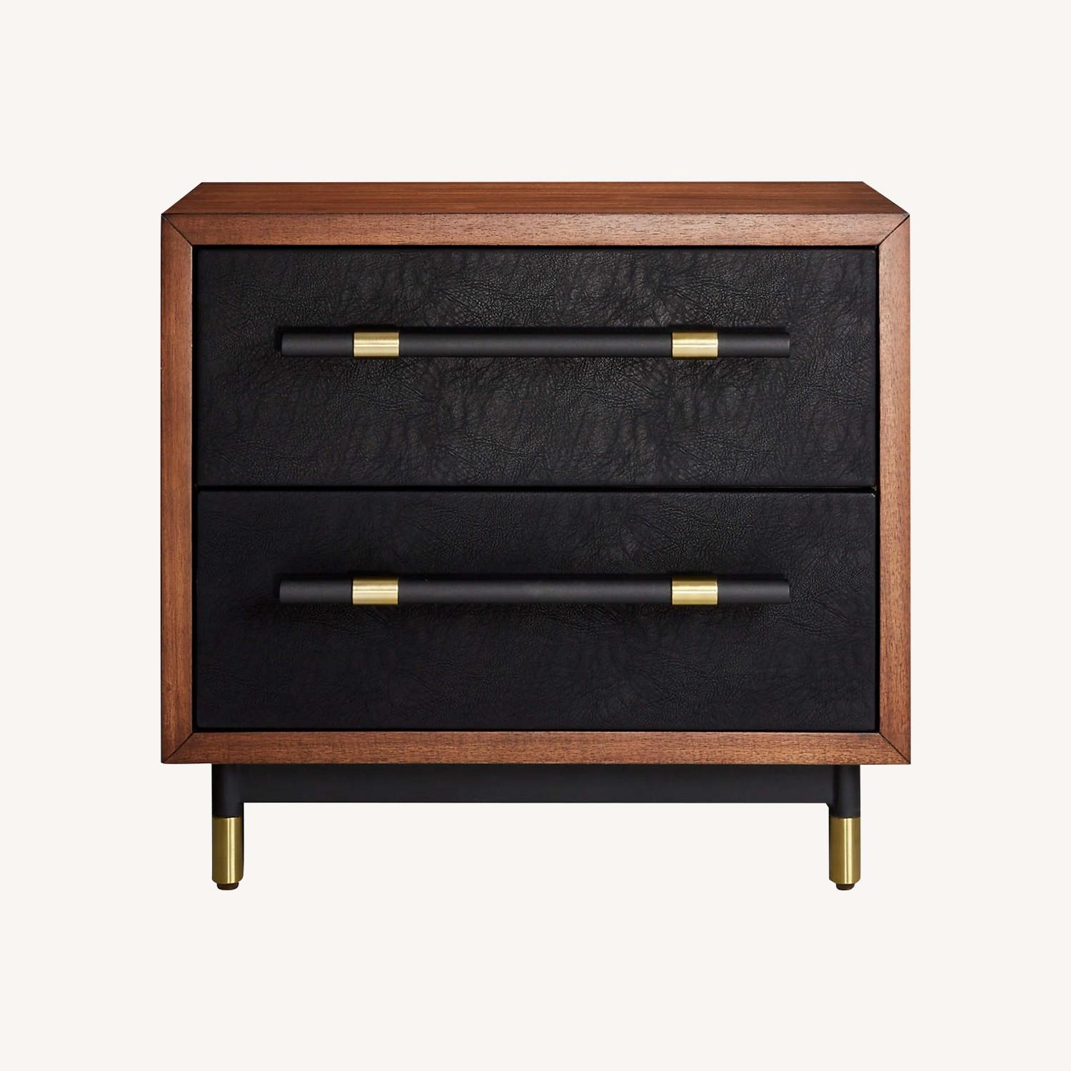 Seller's Notes:Minimal wood frame holds two deep drawers fronted with beautiful black vegan leather. Slim black wood handles with brass detail stretch nearly the length of the drawers. Inset cylinder-like legs clad in brass create a clean, elegant line. Learn about VUUE on our blog. CB2 exclusive.