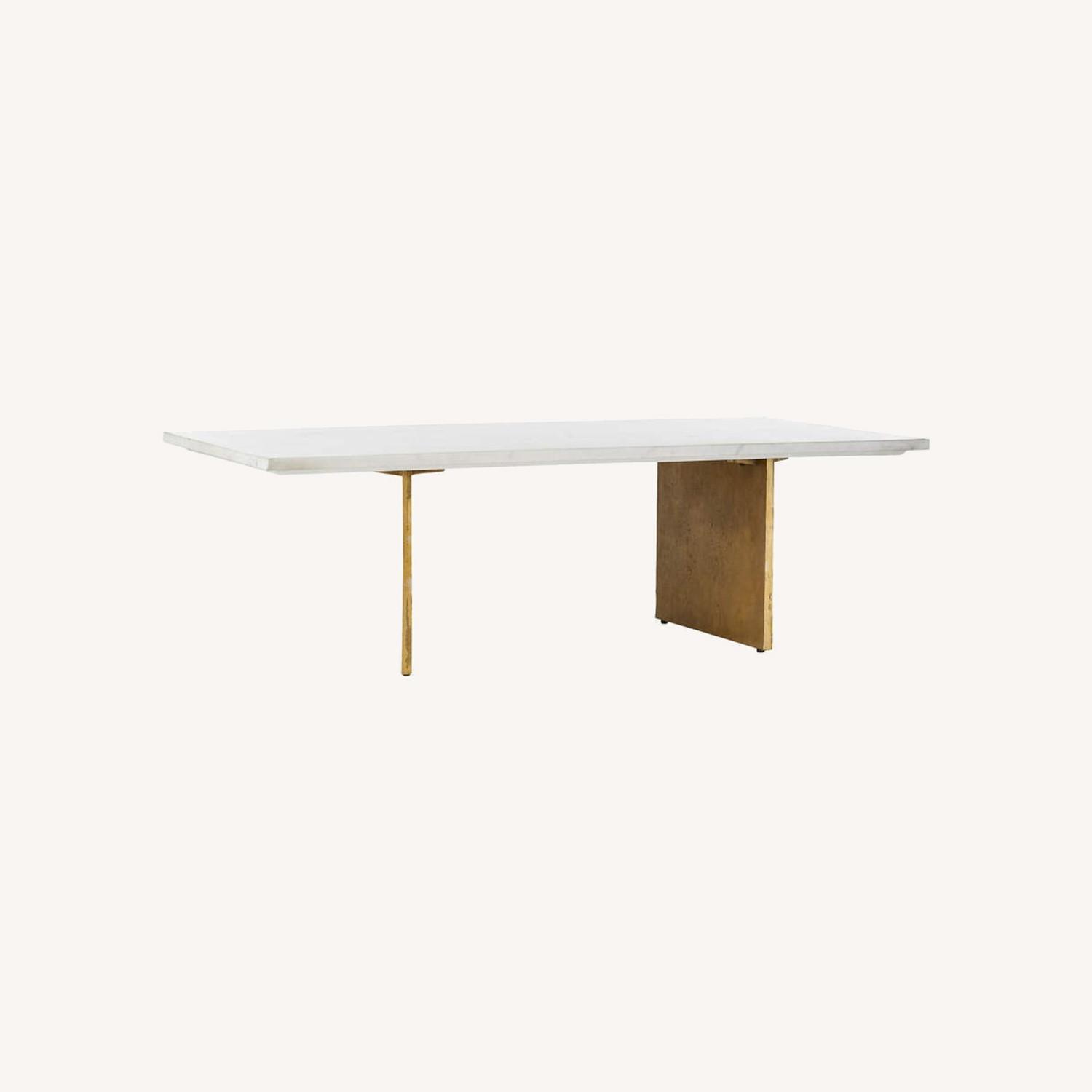 Seller's Notes:Minimal design meets the most exquisite materials in this luxe coffee table by Julia Von Werz. Clean rectangular top in polished white marble rests on two shiny warm gold legs — one perpendicular, one angled. Linear and refined, piece was inspired by a marble table in Von Werz's family home. Learn more about Julia Von Werz on our blog. CB2 exclusive. Designed by Julia Von Werz Polished white marble Cast aluminum legs with shiny gold finish Variation in veining and activity of marble is to be expected; each piece will be unique Made in India There is a minor scratch that I included in the photos. Moving and want something different for my new space!