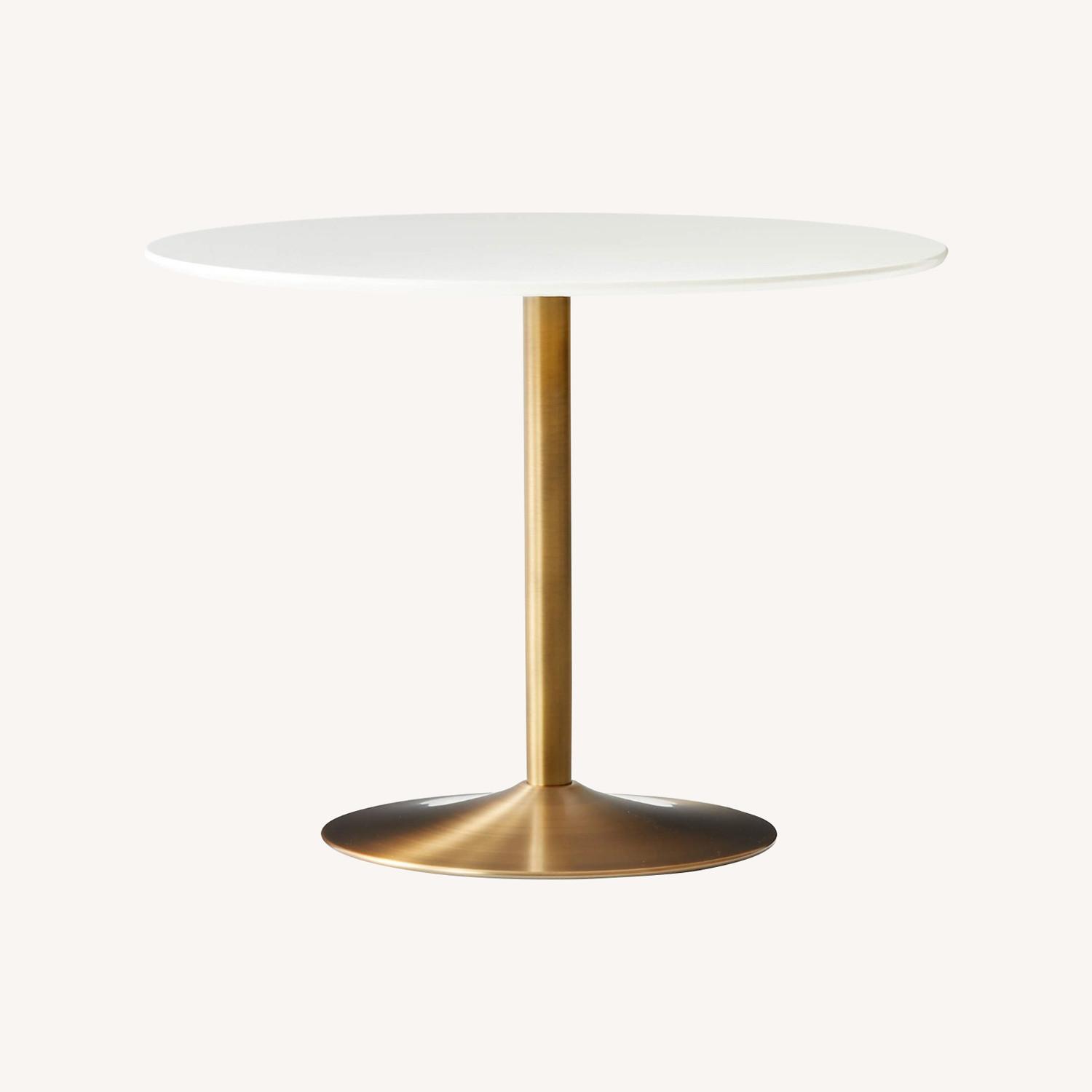 Seller's Notes:Gorgeous dining table that seats 2-4 from CB2. Details from CB2 site: Top: wood composite with white hi-gloss lacquered finish Base: metal with brass plated finish Beveled rim Seats up to four Dust with a soft, dry cloth; use damp cloth when necessary Do not use furniture polish There are minor scratches on tabletop as well as one chip in tabletop about 1/2 inch big (as seen in images). Recently moved and don't need in our new space!