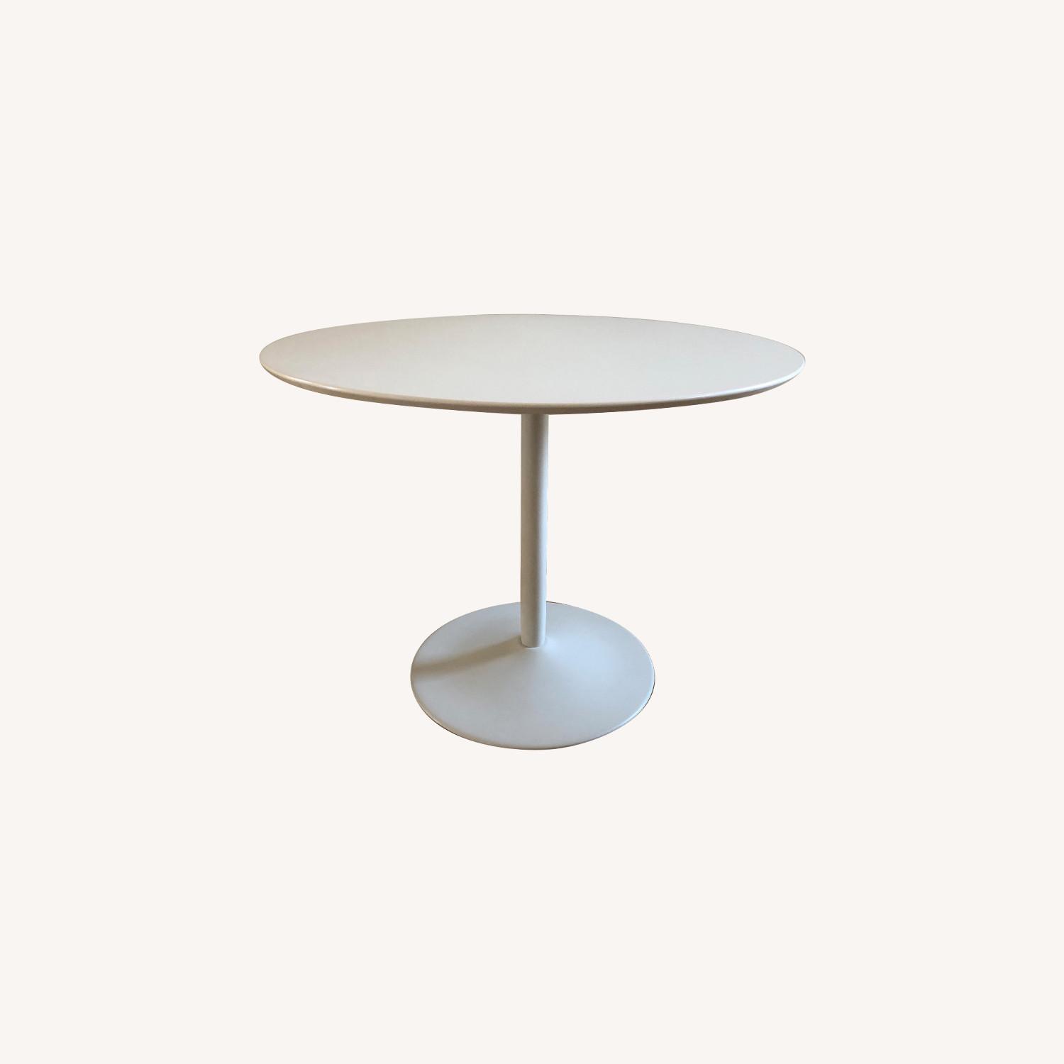 Seller's Notes:A high styling, hardworking table for all your spaces: dining, kitchen, living, office. Top: wood composite with smooth white lacquer finish. Base: metal with white powdercoat finish. Beveled rim. Genuine CB2. Table is in good shape, but has minor scratches on surface from two years of use. 39.25 inches in diameter. Wife wanted a new table, so we're selling this one.