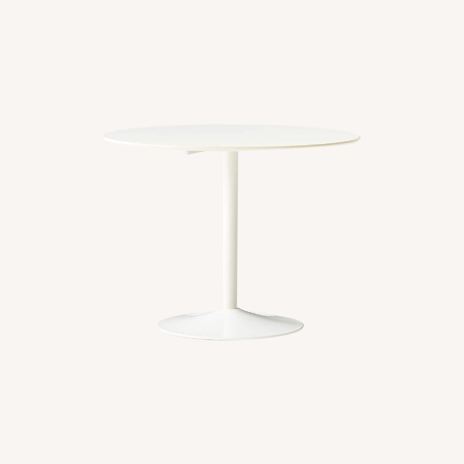 Seller's Notes:Top: wood composite with smooth white lacquer finish Base: metal with white powdercoat finish Beveled rim Genuine CB2. Lightly used dining table from CB2 originally purchased in 2018. Can seat up to 4. "A high styling, hardworking table for all your spaces: dining, kitchen, living, office. White lacquered wood composite disc beveled at the edge floats on a white powdercoat metal pedestal that seems to emerge from the floor." Some minor chipping around the edges (see pictures). Top can be separated from base for storage and transportation.