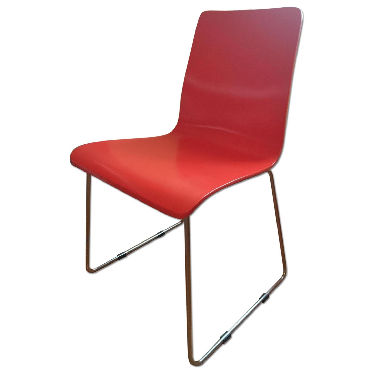 Seller's Notes:Selling these two stylish "Echo orange chairs", bought ~2 years ago from CB2. These chairs set really cool color accents in any apartment. Only small signs of use on the surface. Original price was $90 per chair. Orange swoop. Lacquered bent plywood curves in one brite orange swoop on brushed nickel steel sleigh. Just right height back tapers to wide accommodating seat. Protective glides. Bent plywood in orange lacquer. Steel sleigh frame with brushed nickel finish. Protective glides included. Overall Dimensions: Width: 19" Depth: 18" Height: 33" Seat: Height: 18"