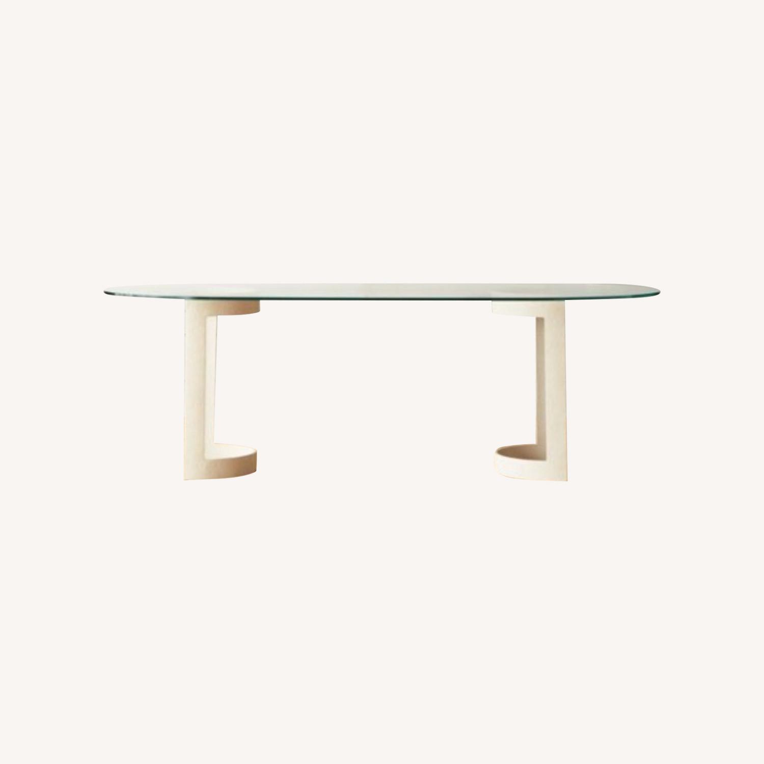 Seller's Notes:White plaster-like bases anchor an oval glass top on this dining table designed by Mermelada Estudio. Ultra clear glass is heat-treated for strength, minus the green edging often seen in tempered designs-it's a crisp, more high-end look. Learn about Mermelada Estudio on our blog. CB2 exclusive. Designed by Mermelada Estudio -2-piece cast aluminum base in white textured powdercoat with levelers -12mm tempered glass top -Clean top with a glass cleaner, dust base with a soft cloth
