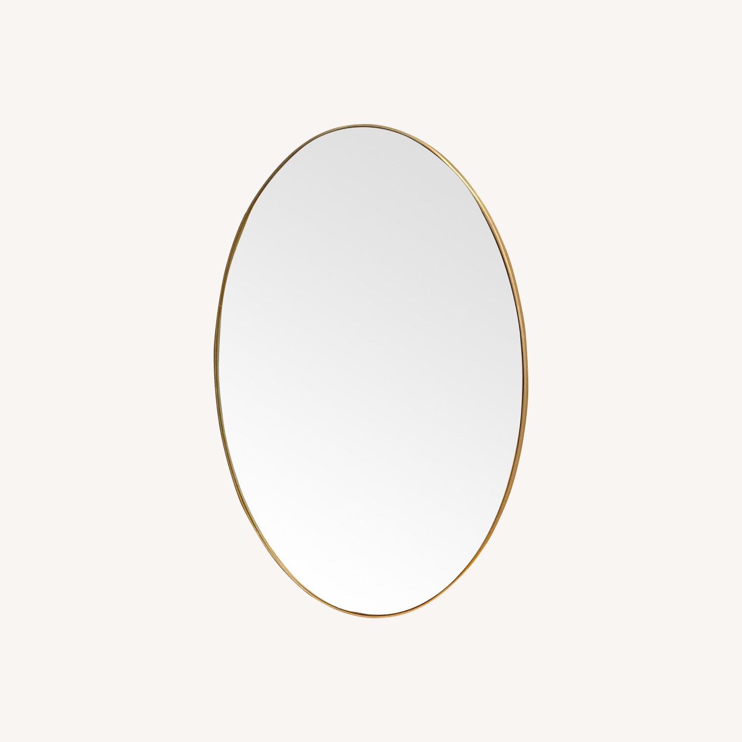 Seller's Notes:Cb2 Infinity Oval Mirror. Color: Brass. Hang vertically or horizontally. Mounting hardware not included. Light scratches and discoloration on frame (please see images).