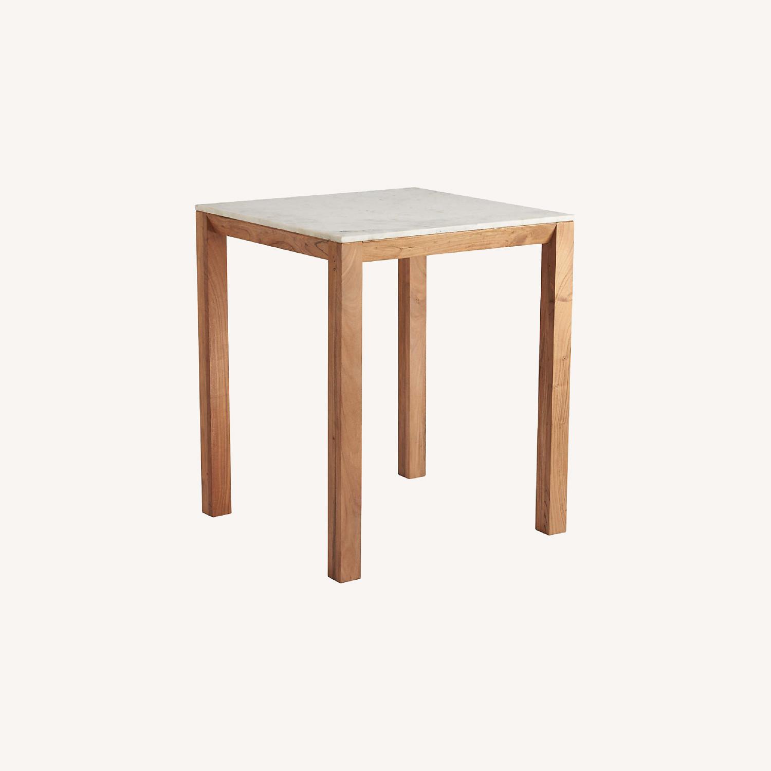 Seller's Notes:Banswara white marble top with soft grey veining Solid sustainable acacia wood frame with clear lacquer finish Seats up to four Genuine CB2.