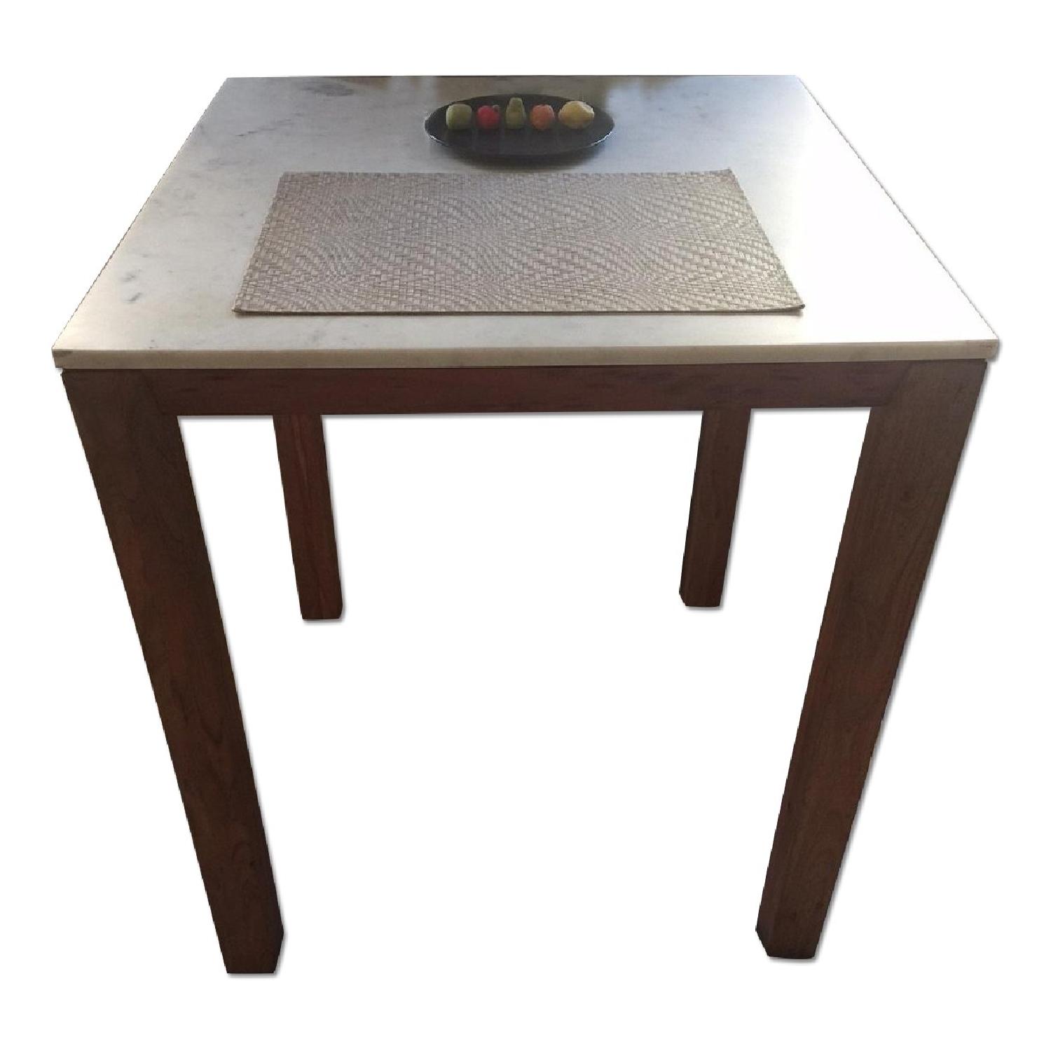 Seller's Notes:This is a great small table that seats 4, usable for small-party dining, as a kitchen island, or even as a standing desk. It's crafted from Banswara white marble, with a sleek square top that seems to float on the Parsons-style acacia wood frame due to a neat chamfered edge.