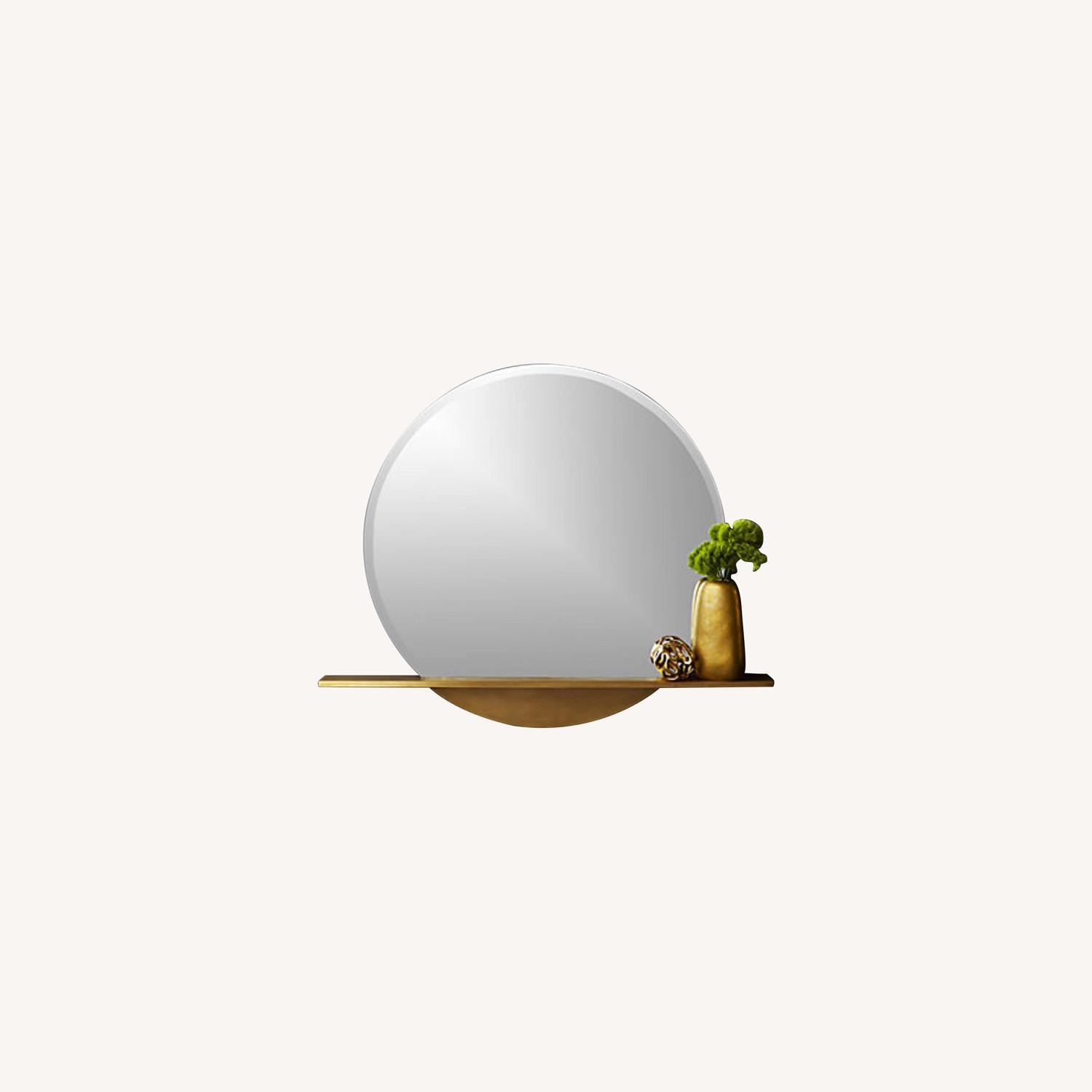 Seller's Notes:Round mirror rises out of built-in brass ledge. Shelf extends long, creating a daring silhouette and practical storage solution. Ideal for displaying design objects in the entry or adding polished cool to the vanity. May not include hardware. CB2 exclusive. Genuine CB2.