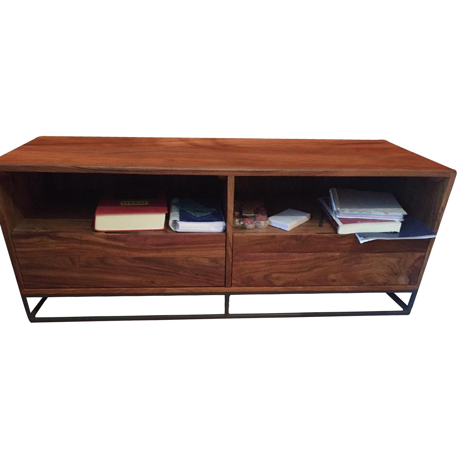 Seller's Notes:Looks brand new. No visible damage Description from CB2: Nature channel. The eco beauty of plantation-grown shesham wood warms modern in au naturel media hub by Mark Daniel of Slate Design. Active grain contrasts industrial open iron base powdercoated graphite. Two open component cubbies span over two closed drawers cleverly angled to open sans pulls on smooth metal glides. Neat details to note: Console is fully finished in back with panel design to float in the room; hidden cutouts discreetly manage cords. Learn about Mark Daniel on our blog. Details and Dimensions: Prime media console. 48"Wx17.5"Dx19"H. Designed by Mark Daniel of Slate Design. Plantation-grown shesham wood with matte lacquer finish. Base is solid iron with graphite powdercoat finish. Drawers have steel glides. Hidden cord management. Included anti-tip hardware recommended for added stability. Made in India. Overall Dimensions: Width: 48" Depth: 17.5" Height: 19" Front Openings: Width: 23" Depth: 15.75" Height: 6.5" Drawer Interiors: Width: 20.75" Depth: 13.5" Height: 4.5" Metal (Floor To Base): Height: 4"