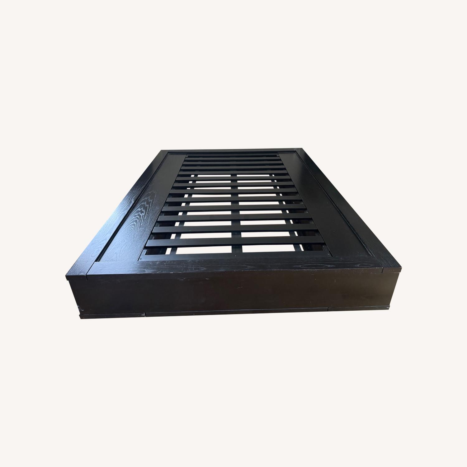 Seller's Notes:Queen sized black wooden platform bed with storage cubbies on both sides.