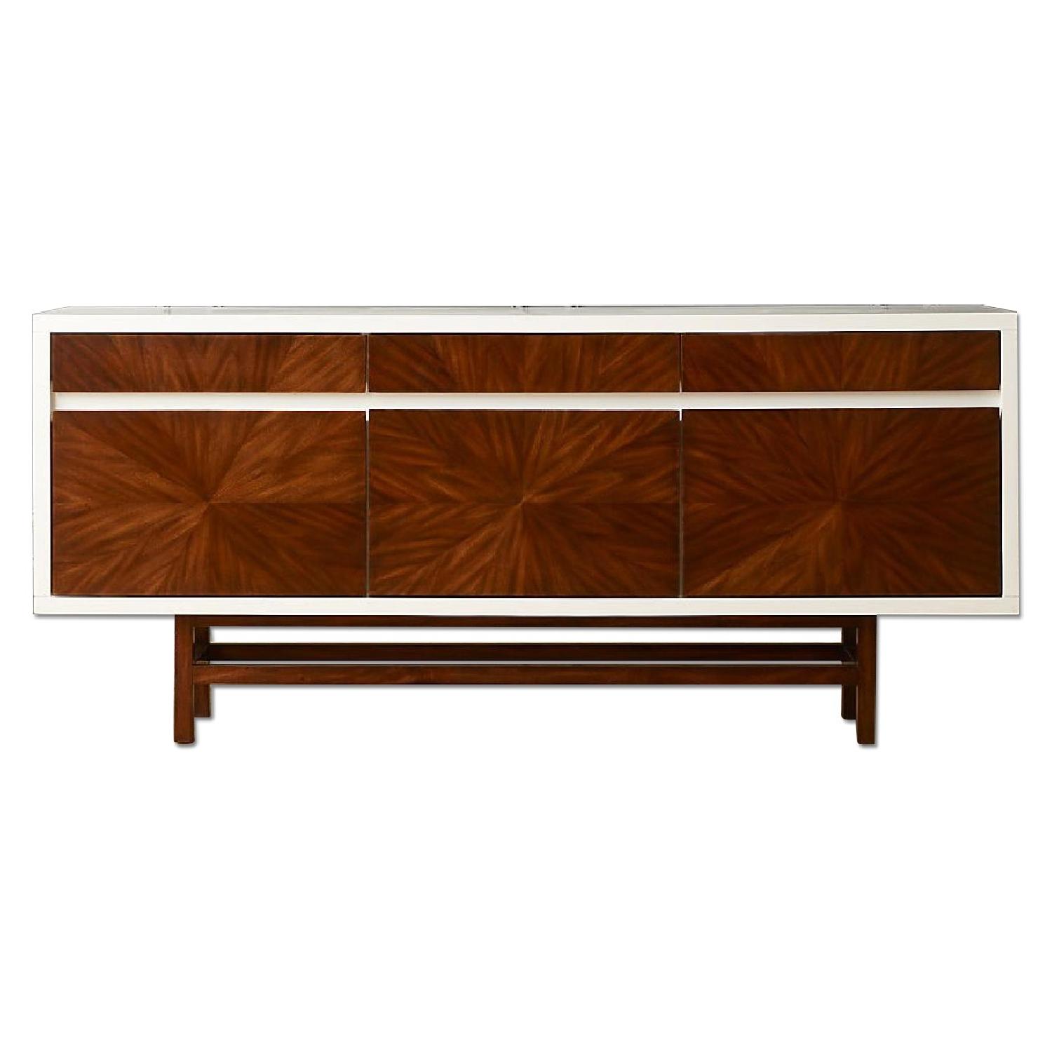 Seller's Notes:chic combo. A visually stunning mix of materials and design ideas by Zak Rose. Midcentury hi-gloss white frames deco-inspired mahogany door and drawer fronts with a unique starburst design. Linear inset mahogany wood legs meet via mortise and tenon joinery, a true sign of craftsmanship. Three doors hide three shelves and discreet cutouts for cord management. Three drawers finish out the storage. A remarkable piece for the dining room. Works as a media center, too.