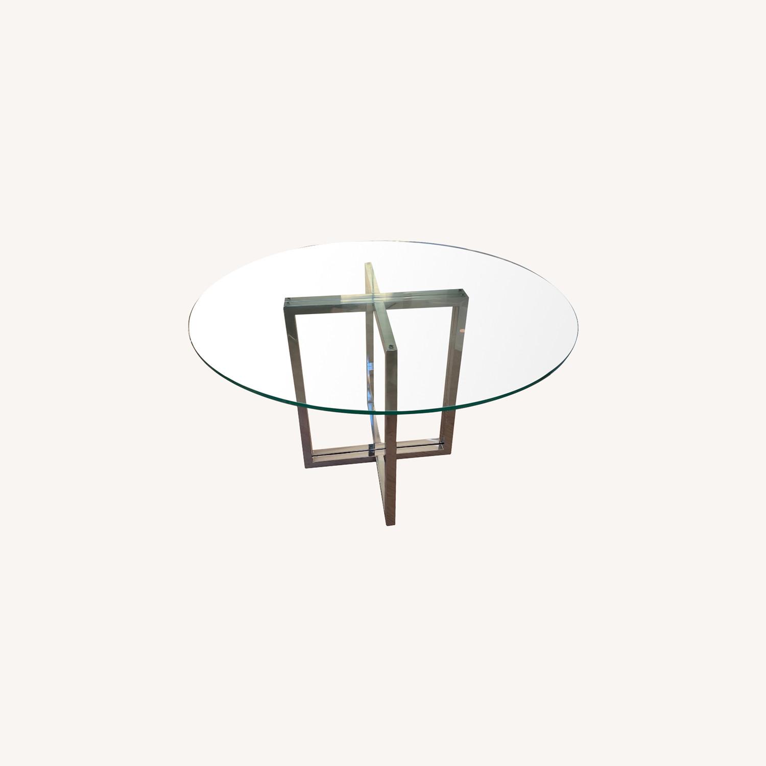 Seller's Notes:CB2 SILVERADO CHROME 47" ROUND DINING TABLE. Only 3 years old in excellent condition with minor blemishes. Not exposed to smoke/pets. Two modern chrome "sawhorses" hold the 1/2 inch thick glass top.