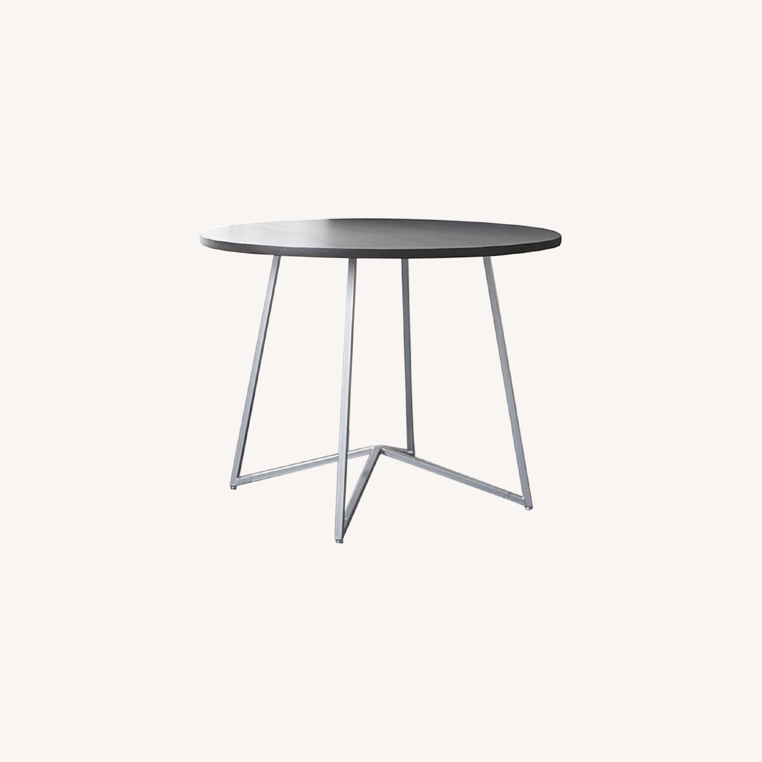 Seller's Notes:In good pre-owned condition, normal wear 40" dia. x 30"H Top: Solid sustainable mango wood with sheer charcoal grey stain Base: Iron square tube with antiqued silver powdercoat Seats up to 4 "To the point. Playing much more than a supporting role, this architectural base steels the show. Four beams of square iron tube meet in the middle as geometric sculpture, powdercoated silver with hand-applied antiqued finish. Four-seater is topped by smooth round of solid sustainable mango wood, washed in a charcoal grey stain that allows the sweeping grain and hi/lo tones to show through." More info: https://web.archive.org/web/20160203190815/http://www.cb2.com/peak-dining-table/s135127