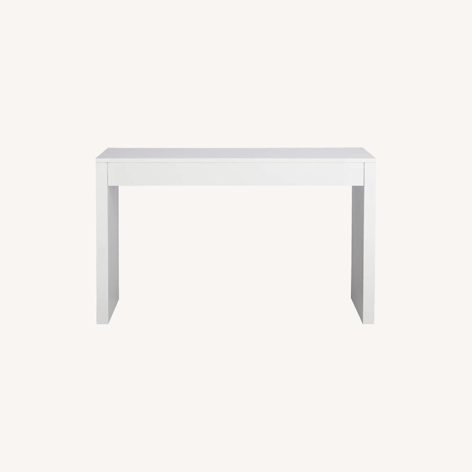 Seller's Notes:This desk has made for a great entrance piece for my apartment. This has been used for under a year and has a few scratches and blemishes from the wall and on the left side (from being next to my guitar case). The desk is in amazing condition and can be used for a variety of ways. CB2 Description: one sleek piece. Hi-gloss white lacquer desk downsizes for space but ups the style quotient for office, entryway or bedroom. Discreet sleek dual drawers organize desk supplies and papers, keys and mail (perfect entry console), even cosmetics (makes a great vanity, too). Engineered wood with hi-gloss white lacquer Two drawers Clean with soft dry or damp cloth Assembly required; hardware included Made in Vietnam