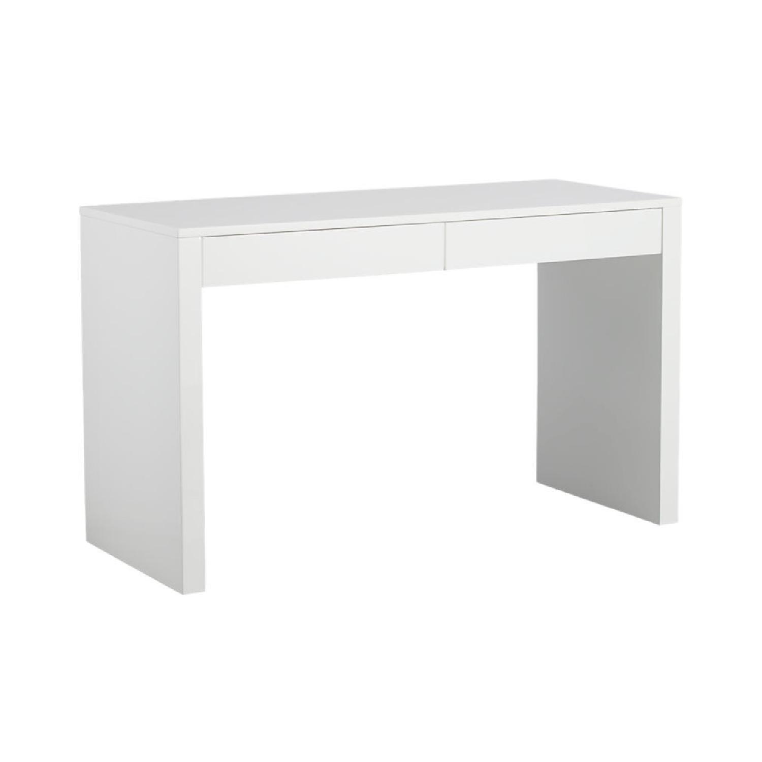 Seller's Notes:Hi-gloss white lacquer desk downsizes for space but ups the style quotient for office, entryway or bedroom. Discreet sleek dual drawers organize desk supplies and papers, keys and mail (perfect entry console), even cosmetics (makes a great vanity, too). Only one year old! Barely used because my job requires a ton of travel.