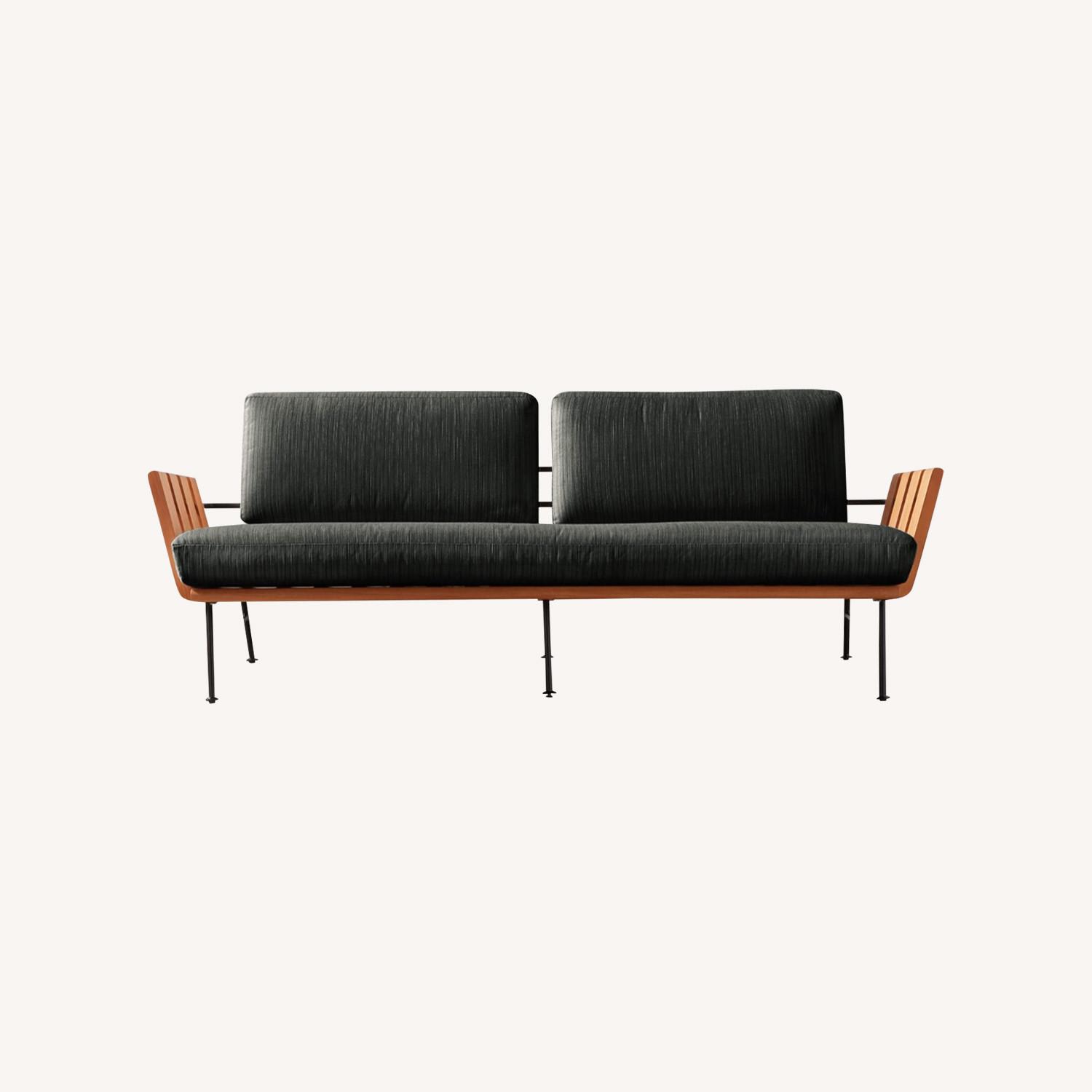 Seller's Notes:Teak Outdoor sofa by Lawson-Fenning for CB2 . Perennials Outdoor fabric cushions. Color: Coal. We have stored this indoors. In like new condition. Comes with a cover.