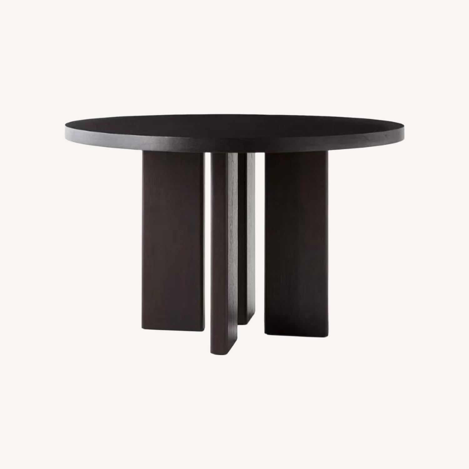 Designer Kara Mann's solid walnut dining table is finished in her signature blackened tone that can be found throughout the collection. Round, with four geometric legs, the table feels relaxed and timeless, never fussy. Sits four easily in the dining room or breakfast nook. CB2 exclusive.