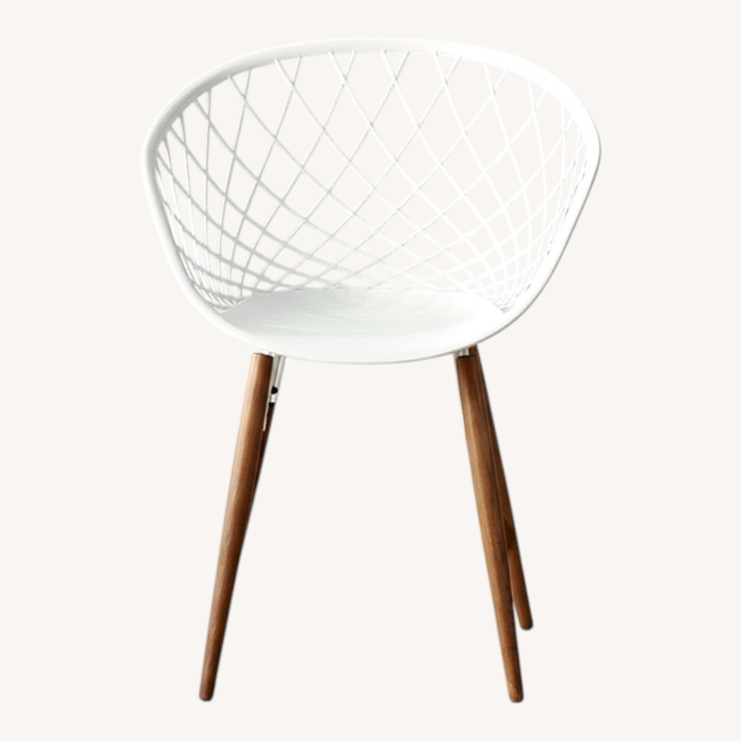 Seller's Notes:sculptural seat. High-tech construction meets classic modern design. Made in Italy, sleek molded plastic sculpts a woven crosshatch pattern on tapered solid ash wood legs. Light/medium brown stain pairs perfectly with the clean white frame for an updated Scandi feel. Super roomy seat pulls up perfectly as head dining chair or desk chair. Sits perfectly as a side chair, too. • Legs: Solid ash wood • Seat: White techno-polymer shell • Some assembly required • Dust with a soft, dry cloth • Protective feet pads is recommended • Made in Italy