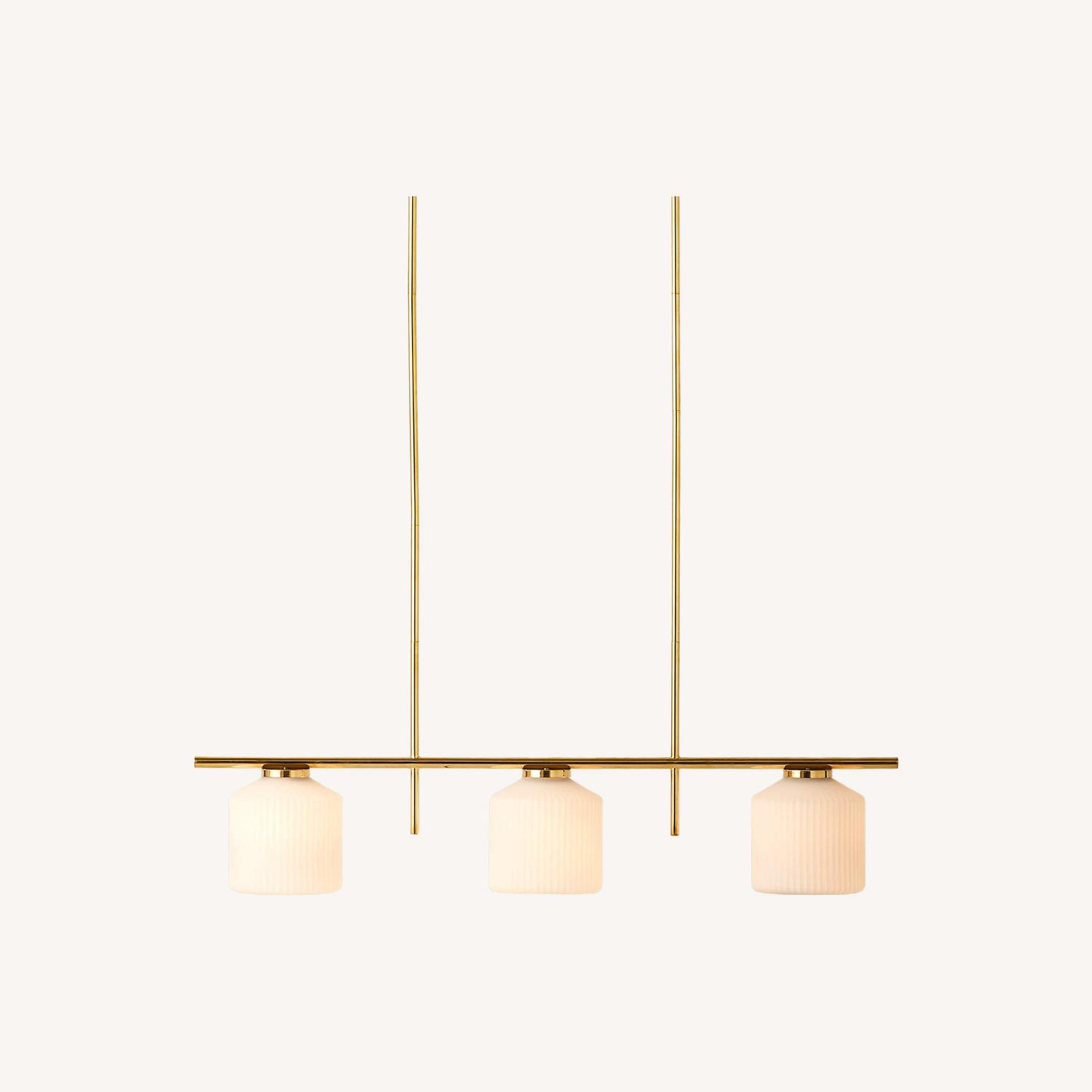 Modern linear pendant light by Axel Mert appears delicate with thin unlacquered polished brass rods. Three ribbed textured matte glass shades, inspired by the pleasing architecture of grass huts, cast a soft, inviting glow. "This light is a memory of three big silos that were on the road to my grandma's house," Mert says. "All the design is based on the glass shade: its shape, its reflection and its color. The discrete structure underlines them. Together, they create a simple but also sophisticated pendant light." CB2 exclusive. Due to the nature of the material, brass patina will vary in color and darken over time.
