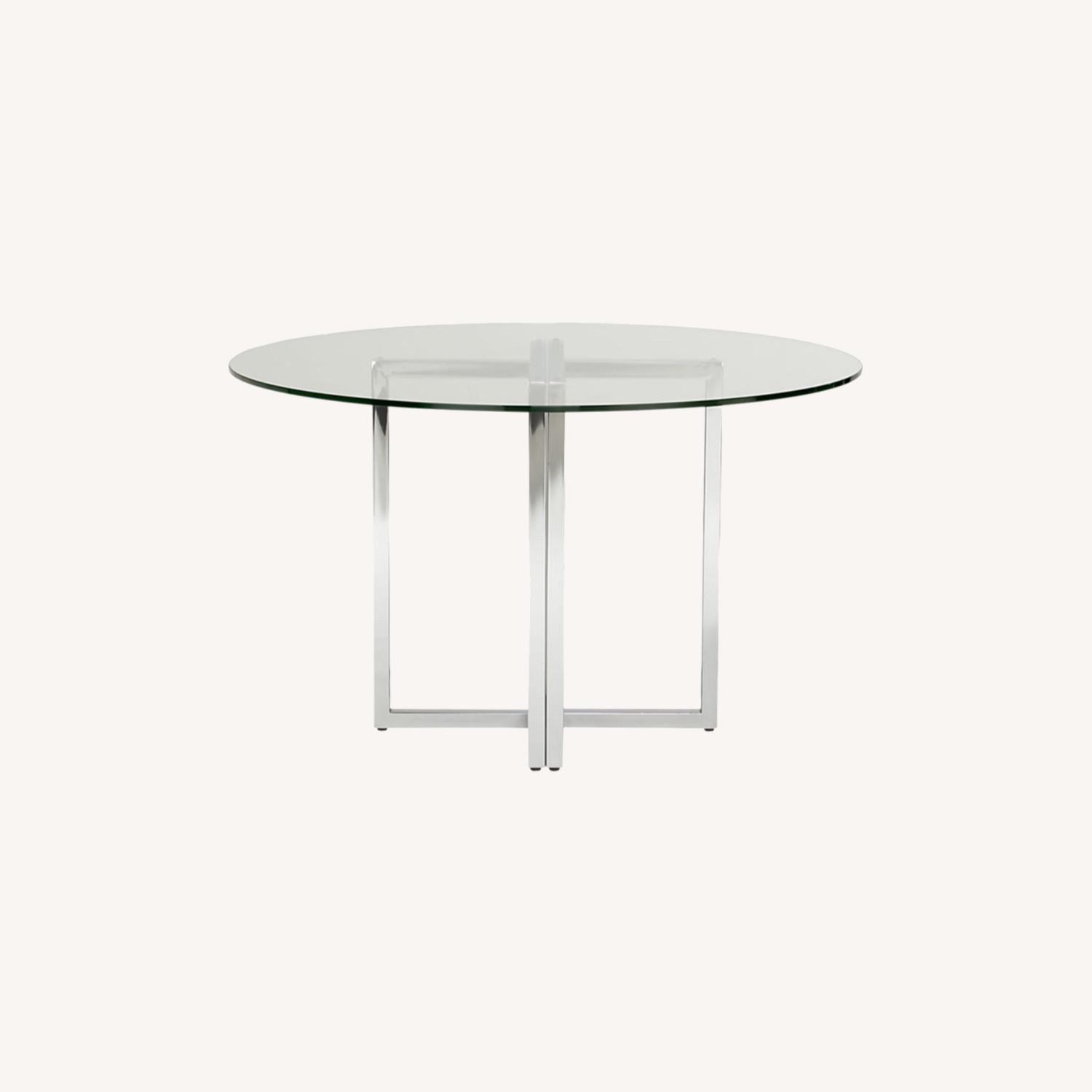 Seller's Notes:Two sleek chrome modern "sawhorses" partner with crisp, clean clear glass tops, round or rectangle—your choice. For more leg room and stability, we suggest the chrome-plated iron structures meet in the middle (shown). silverado chrome 47" round dining table is a CB2 exclusive. HEIGHT 29.25 inches. 2-piece chrome-plated iron base with levelers ½"-thick clear glass top Clean top with a glass cleaner,
