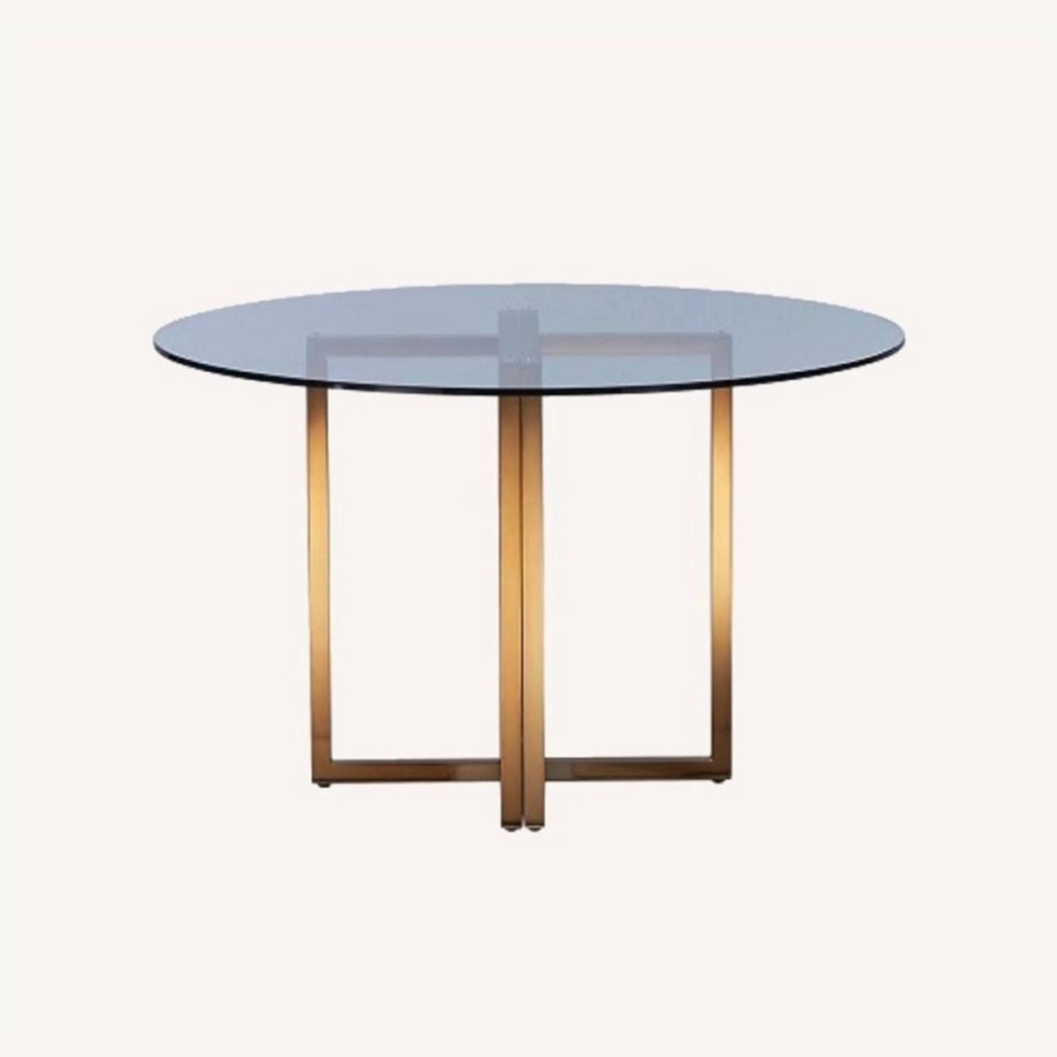 Seller's Notes:CB2 Silverado collection brass and glass dining table, 47” round. Beautiful table, gently used for 2 years, like-new condition.